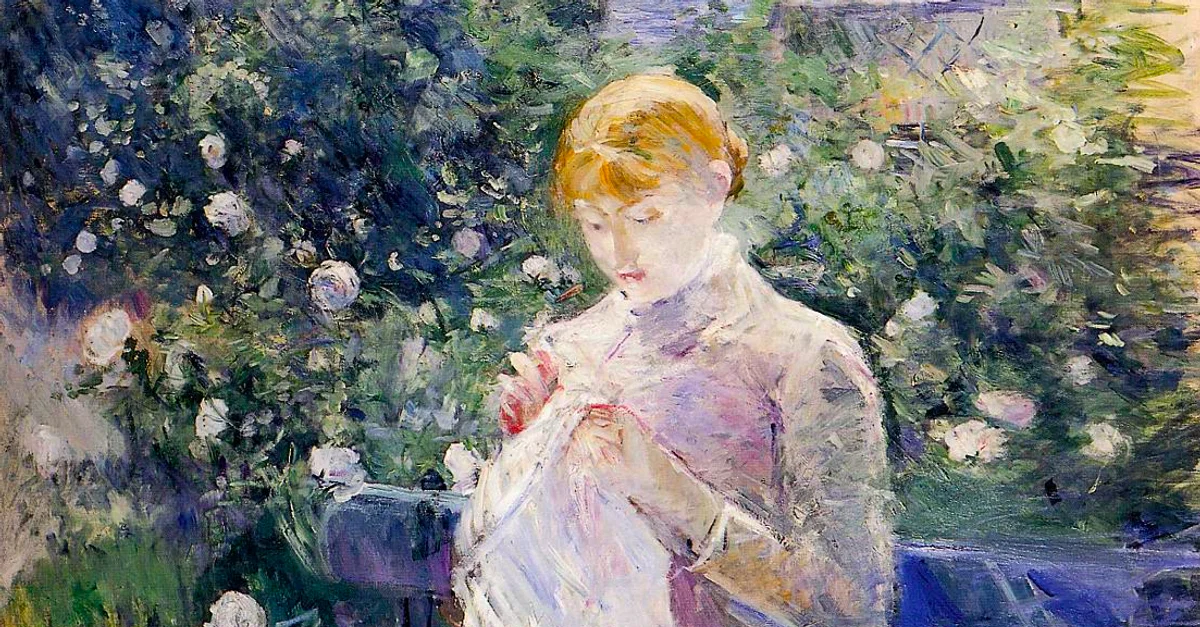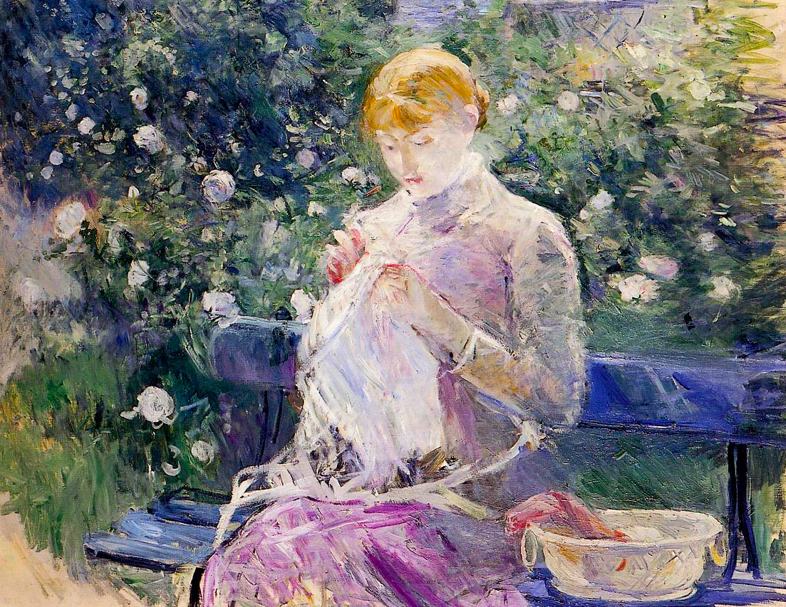 An 1881 oil on canvas painting, Pasie Sewing in Bourgival's Garden, by Berthe Morisot (1841-95), the French impressionist painter. Pasie was the artist's maid and the nanny of her daughter. The tones of lilac and brushstrokes are typical of the artist's work. (Musée des Beaux-Arts, Pau, France)