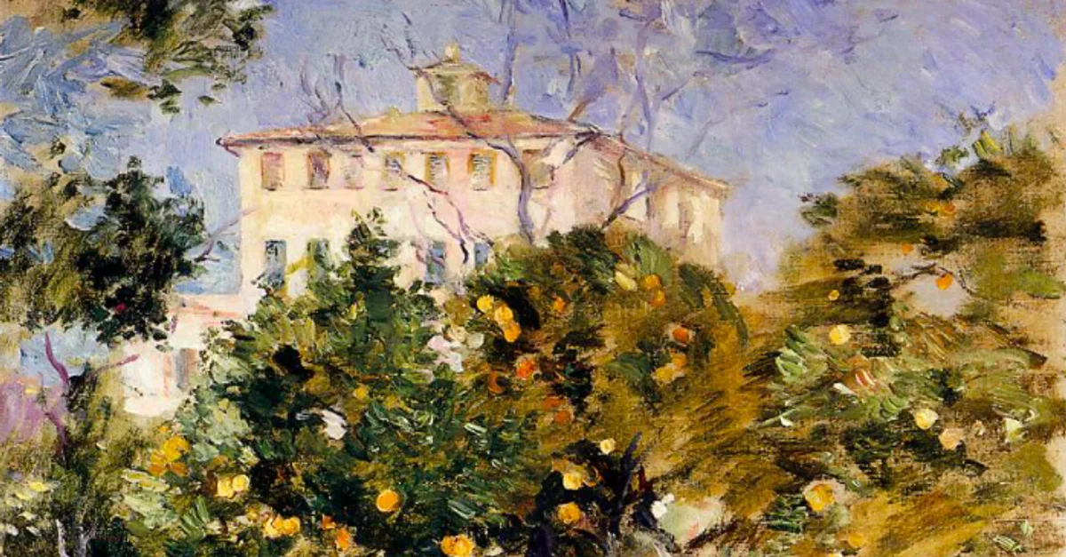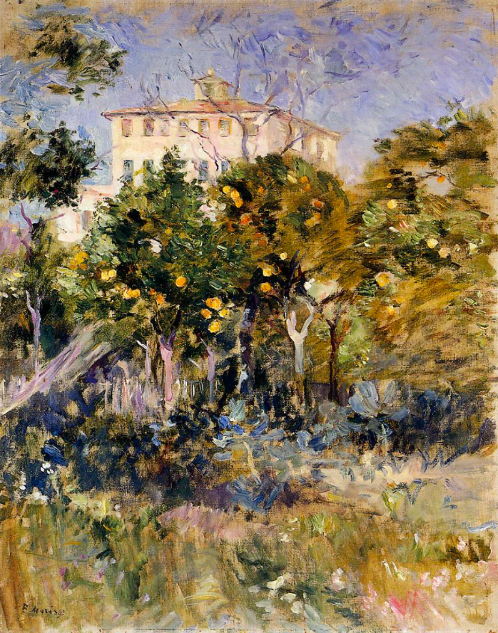 An 1882 oil on canvas painting, Villa with Orange Trees, by Berthe Morisot (1841-95), the French impressionist painter. This scene was painted around Nice in southern France. (Private Collection)