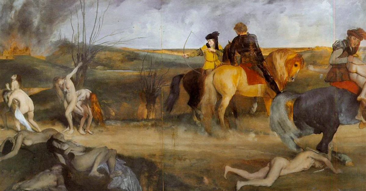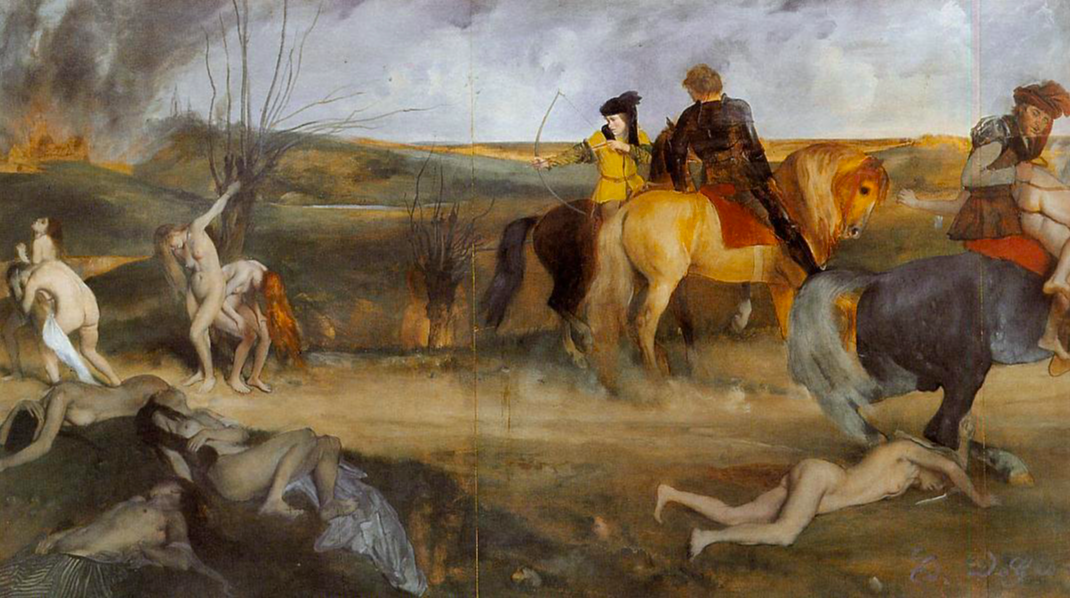 An 1865 oil on canvas painting, Medieval War Scene, by Edgar Degas (1834-1917), the French impressionist painter. The subject is not known precisely, despite the later association of Orléans with the work. Typical of Degas' early career and interest in historical scenes presented in a frieze-like manner, this work was accepted by the Salon in Paris. The artist added an extra strip of canvas on the right side to elongate the scene even further. (Musée d'Orsay, Paris)