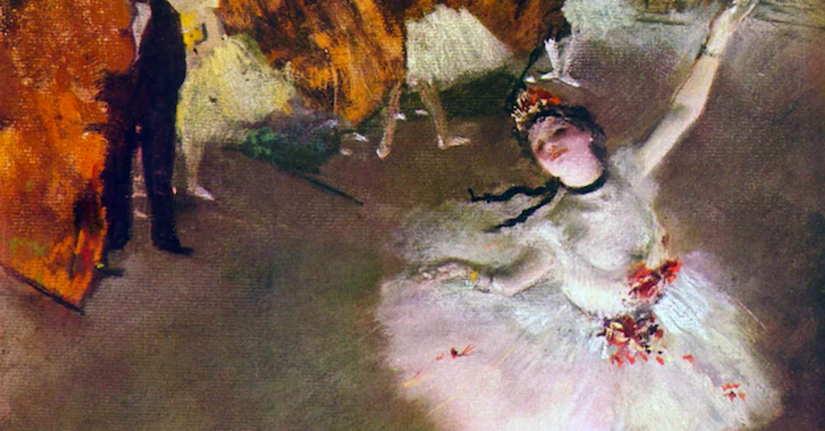 A c. 1876 pastel on paper, The Star (l'étoile), by Edgar Degas (1834-1917), the French impressionist painter. The artist painted many scenes of ballerinas, but most, like this one, are not of the dancers performing but either rehearsing or taking the applause of their audience. The angle at which we see the dancer suggests the viewer is sitting in one of the expensive boxes near to and above the stage. (Musée d'Orsay, Paris)