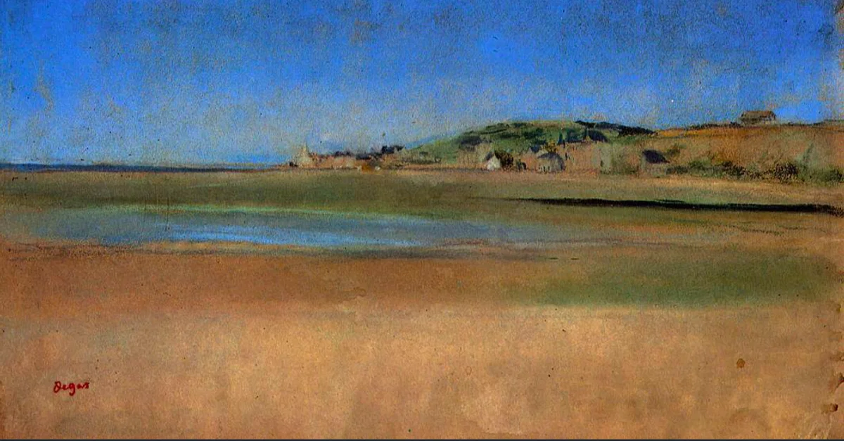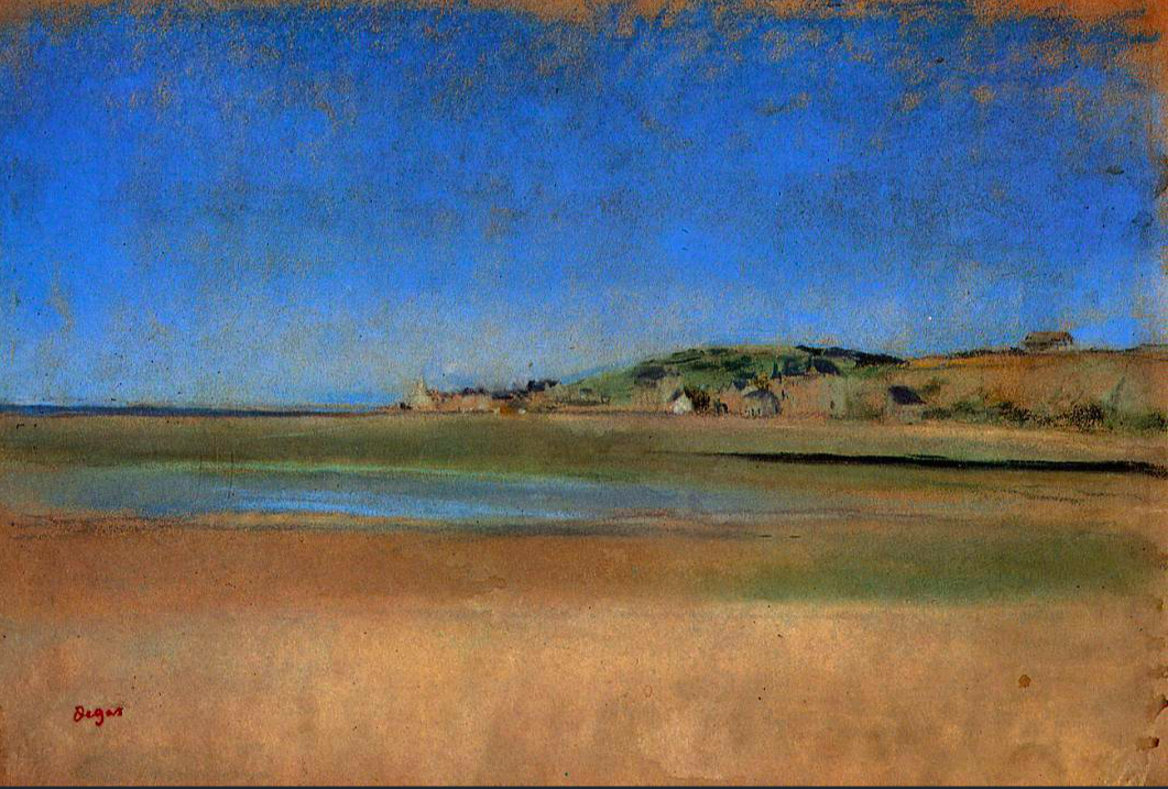 A c. 1869 pastel work, Houses Beside the Sea, by Edgar Degas (1834-1917), the French impressionist painter. Less-known for his landscapes, Degas often uses them almost as an exercise in presenting a harmony of tonal colours. Other features of his landscapes are that they are frequently hazy and do not show people. This work was created on the northern coast of France when the artist visited Villers-sur-Mer and Dives-sur-Mer in Normandy. (Musée d'Orsay, Paris)