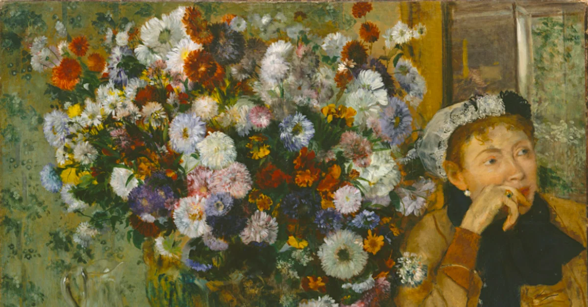 An 1865 oil on canvas painting, Woman with Chrysanthemums, by Edgar Degas (1834-1917), the French impressionist painter. Despite the title, the flowers are dahlias, asters, and gaillardias. Degas rarely painted still life, and here he combines it with a portrait, possibly of the wife of his childhood friend Paul Valpinçon, who must just have completed arranging the flowers since her garden gloves are visible on the table. (Metropolitan Museum of Art, New York)