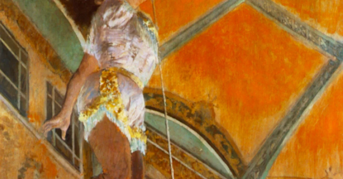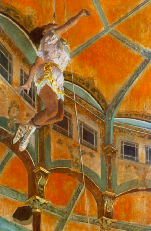 An 1879 oil on canvas painting, Miss La La at the Cirque Fernando, by Edgar Degas (1834-1917), the French impressionist painter. This circus was close to the artist's apartment in Paris and Miss La La's acrobatics – suspending herself from a wire using only her teeth – appealed to Degas' love of unusual viewpoints. The scene appears as it would to an audience member using opera glasses. The off-centre positioning of the acrobat adds to the sensation of her being at a great height. (National Gallery, London)