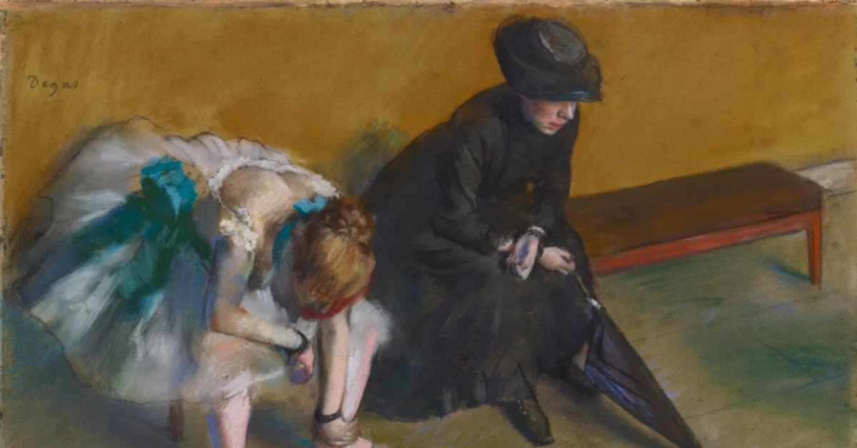 A c. 1882 pastel on paper, Waiting, by Edgar Degas (1834-1917), the French impressionist painter. The artist was keen to show the hard life of rehearsals that ballet dancers had to go through and the aches and pains this caused. Another feature of these behind-the-scenes works is the waiting relations of the dancers, usually mothers. (J. Paul Getty Museum, Passadena, Los Angeles)