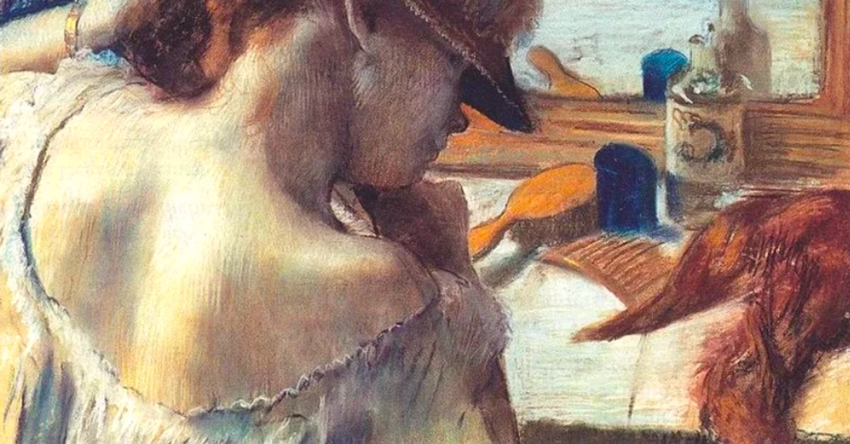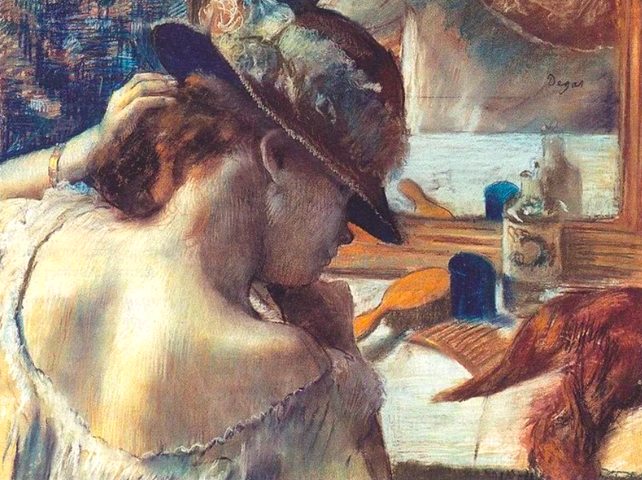 An 1889 pastel on paper, In Front of the Mirror, by Edgar Degas (1834-1917), the French impressionist painter. This work covers several themes that interested the artist towards the end of his career: women at their toilette, women putting on hats, the use of a mirror in the scene to distort the space, a distinctive cropping of the scene, and having the viewer seemingly very close to the subject. (Hamburger Kunsthalle, Hamburg, Germany)