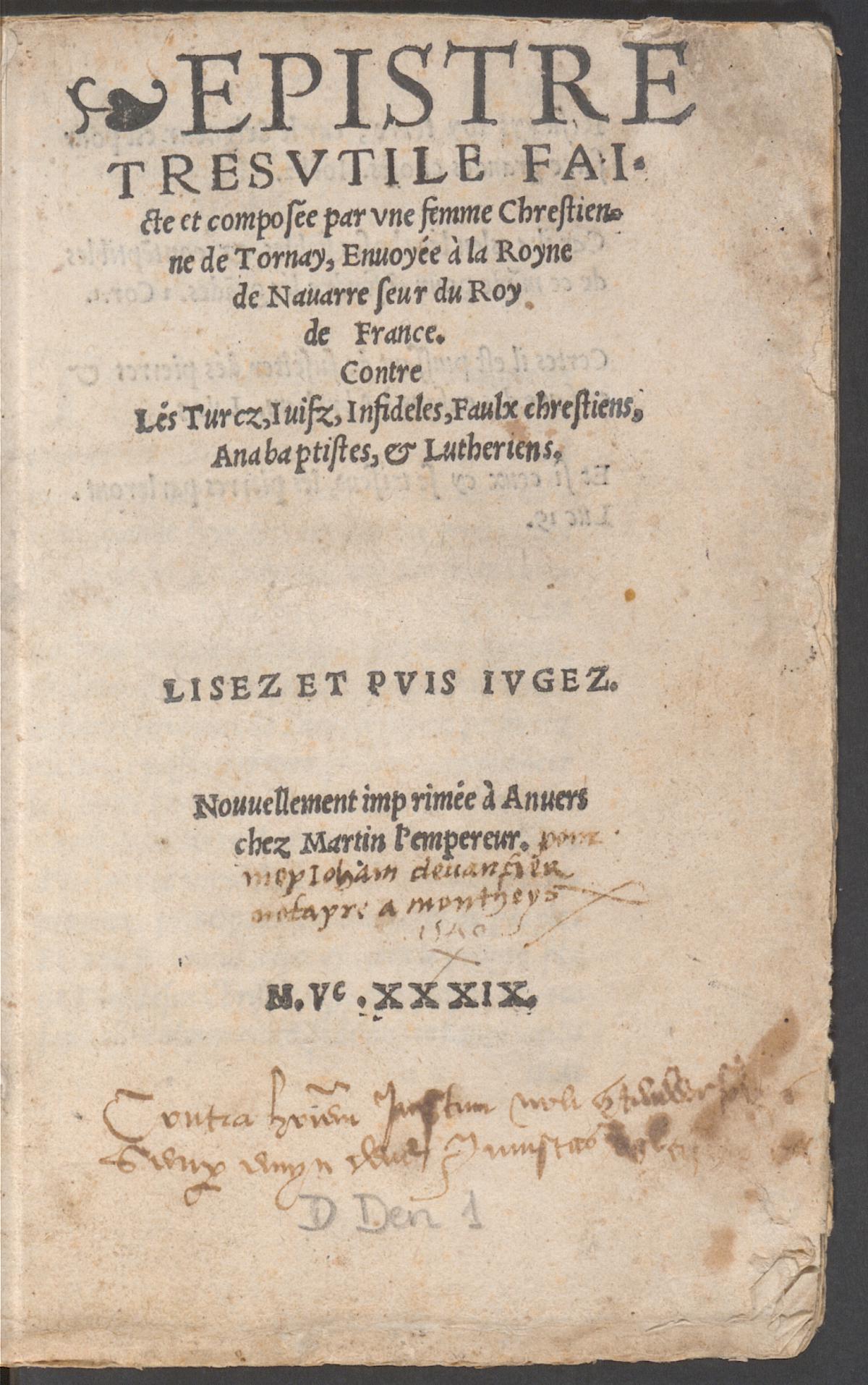 A Very Useful Epistle by Marie Dentière, published in Amberes, 1539.