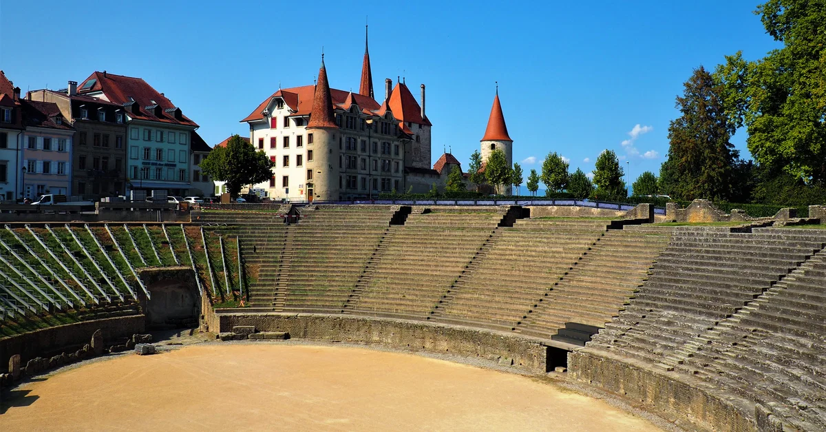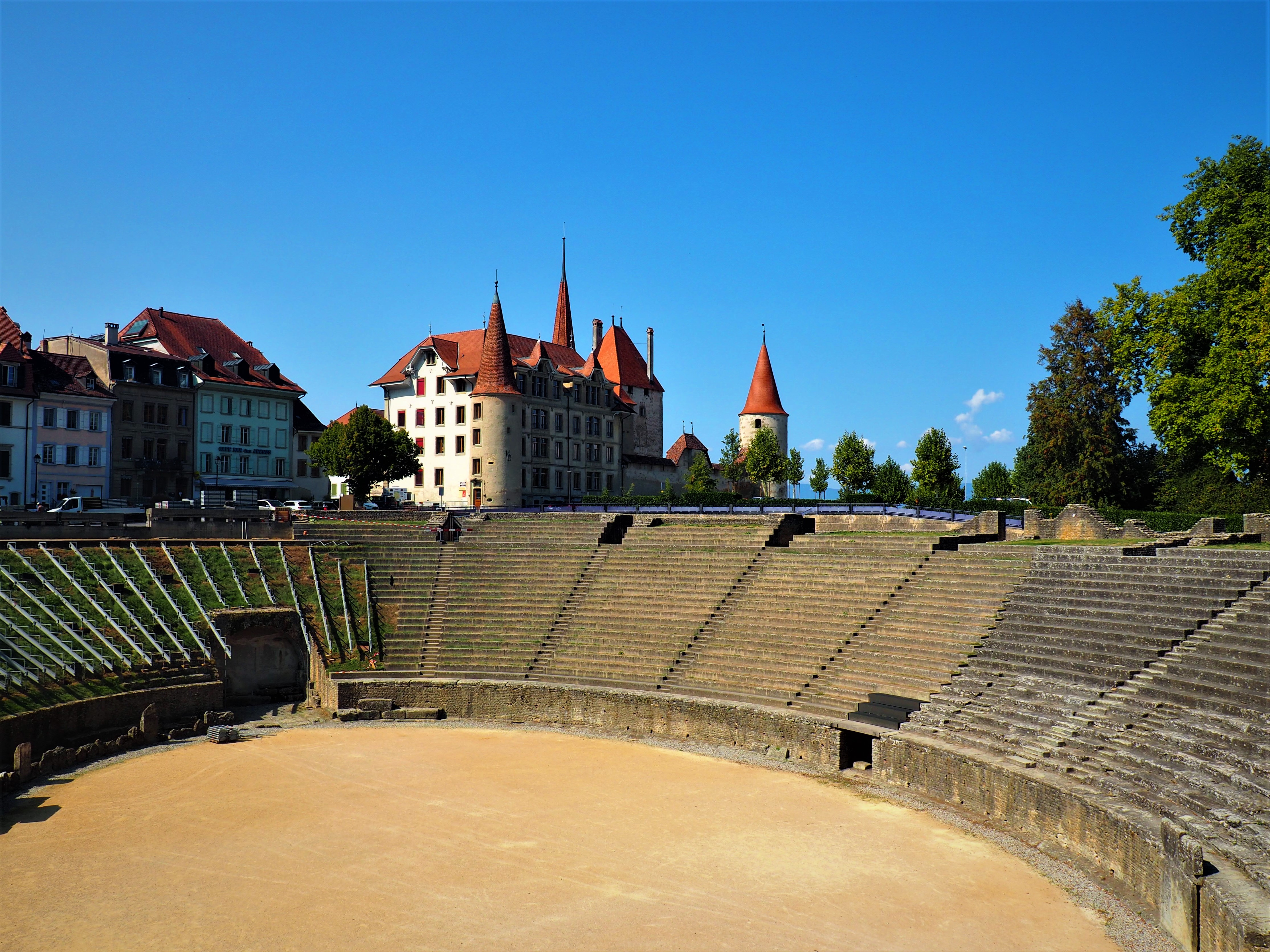 Roman amphitheatre of Avenches, Switzerland, built in the early 2nd century CE, in use until the 4th century CE, used as a stone quarry afterwards. In the 11th century, a fortified tower was built on its eastern entrance and today it serves as a museum.