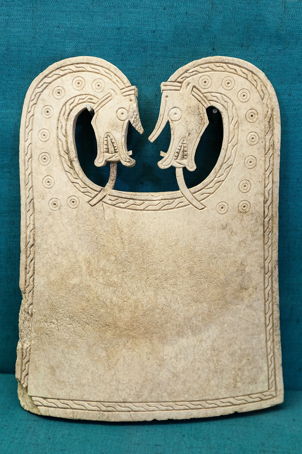 The plaque, carved from one piece of whalebone into the shape of two dragons facing each other, was found in a Viking burial, which was partly uncovered by coastal erosion on the coast near the farm of Scar, and was excavated in 1991. This was a boat burial; the boat was built in Norway and transported to Orkney on a larger boat. At the centre, lay the remains of a woman in her seventies with the whalebone plaque and other grave goods including brooches, spindle whorls, an iron sickle, and shears. Similar plaques have been found in other rich women's graves, mostly in northern Norway. Lying next to the woman were the remains of a child of about ten years of age. At the western end of the boat lay the skeleton of a man in his thirties, with a sword, arrows, a bone and antler comb, and whalebone gaming pieces.