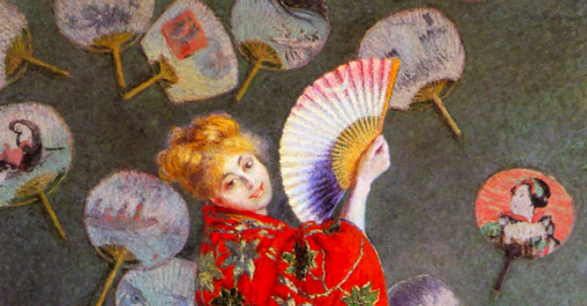 An 1876 oil on canvas portrait, La Japonaise, by Claude Monet (1840-1926), the French impressionist painter. The model was Monet's wife Camille wearing a blond wig. Criticised by the artists' friends and by Monet himself in later life, the work was a deliberate attempt to produce something commercial. The work was sold for 2,000 francs and so fulfilled its purpose. (Museum of Fine Arts, Boston)