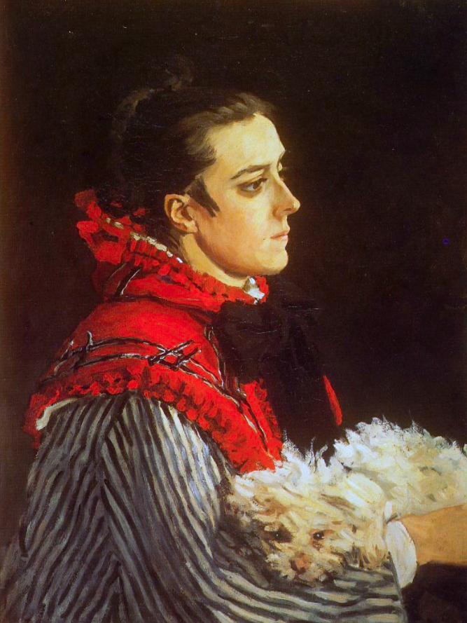 Camille with a Small Dog, oil on canvas by the French impressionist painter Claude Monet (1840-1926), 1866. Camille was Monet's first wife. The strong colours against a black background show the influence of Spanish painters.