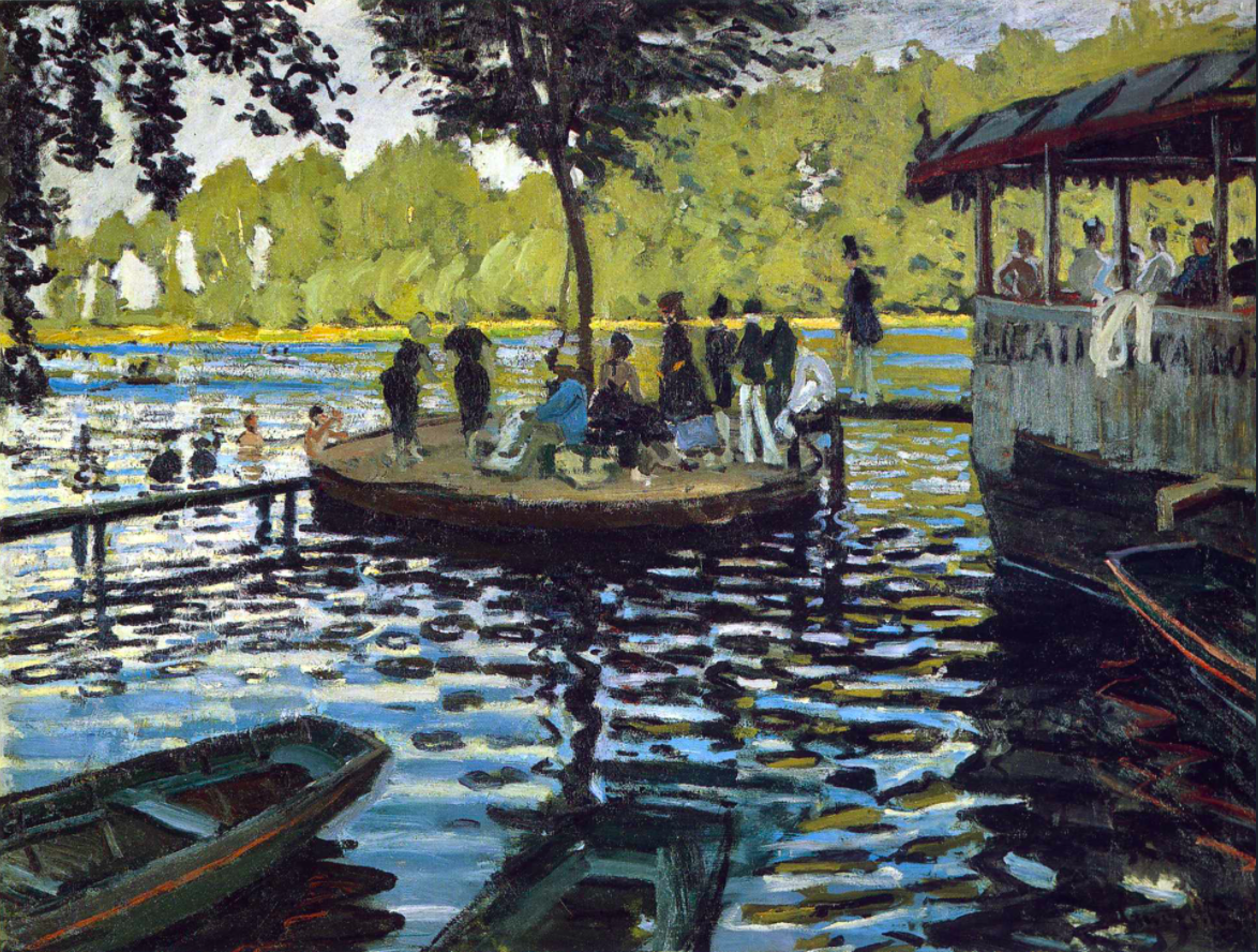 An 1869 oil on canvas, La Grenouilère (aka Bathers at La Grenouilière), by Claude Monet (1840-1926), the French impressionist painter. A popular weekend spot on the Seine, Monet worked here with Pierre-Auguste Renoir (1841-1919). The floating café was called La Grenouilière. This is one of the works art historians consider the beginning of the impressionism movement. (Metropolitan Museum of Art, New York)