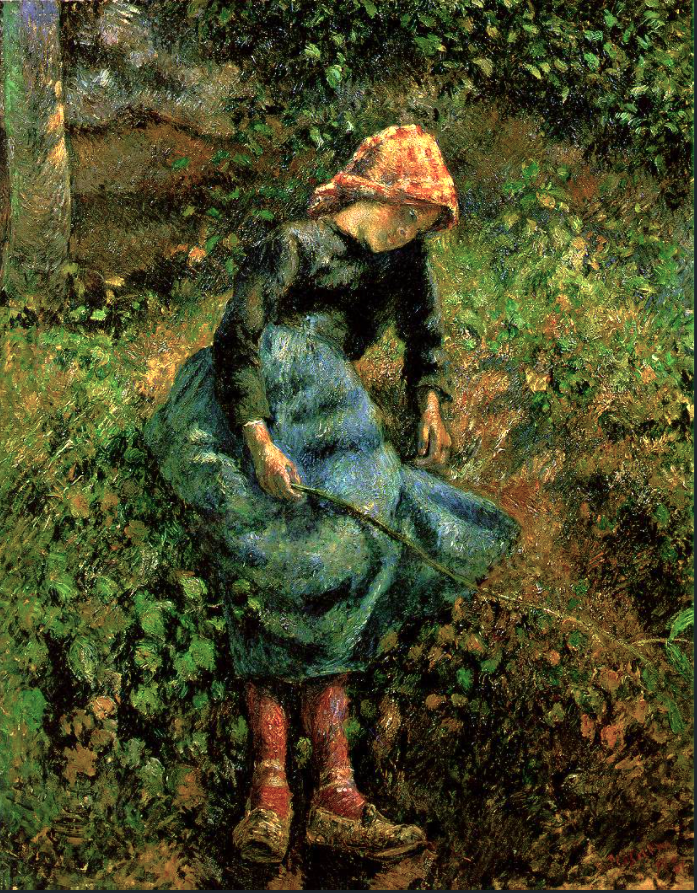 An 1881 oil on canvas, Young Girl with a Stick (aka The Sheperdess), by Camille Pissarro (1830-1903), the Danish-French impressionist painter. The girl's face reflects the colours of the leaves, flowers, and her own hat. The artist said of this very popular painting, "I shall never do more careful, more finished work". (Louvre, Paris)