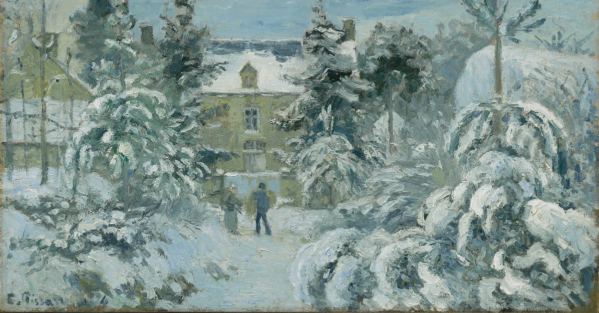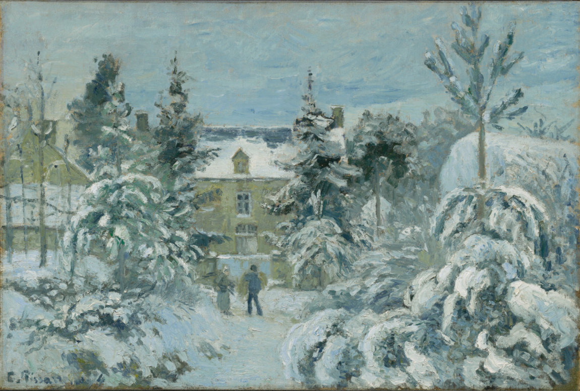 An 1874 oil on canvas, Piette's House at Montfoucault, Snow Effect, by Camille Pissarro (1830-1903), the Danish-French impressionist painter. The house belonged to Pissaro's fellow artist and good friend Ludovic Piette. (The Clark Art Institute, Williamstown, Massachusetts, USA)