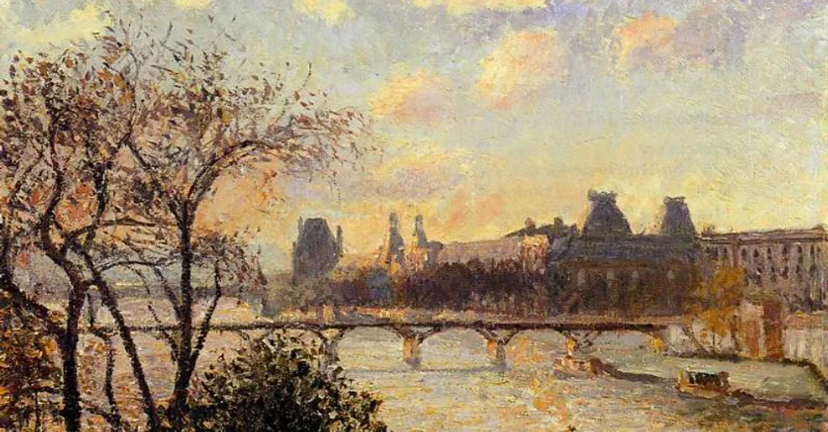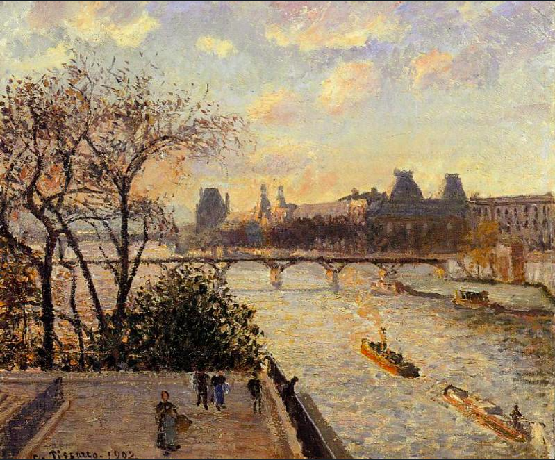 A 1902 oil on canvas, View of the Louvre from Across the Seine, by Camille Pissarro (1830-1903), the Danish-French impressionist painter. The artist painted a series of the exact same view but in different atmospheric conditions. (Croker Art Gallery, Sacramento, USA)