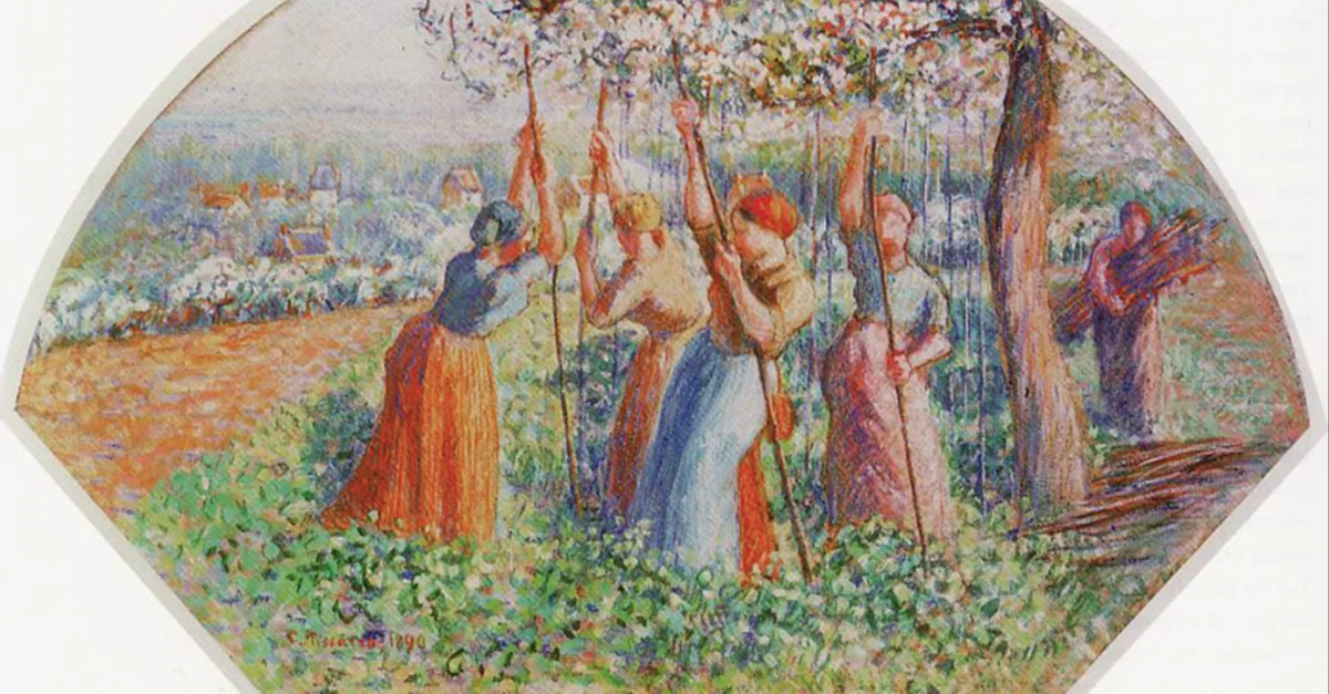 An 1891 gouache and chalk on silk painting, Peasant Women Planting Pea Sticks, by Camille Pissarro (1830-1903), the Danish-French impressionist painter. The artist was interested in capturing an idealised view of rural life in many works. The unusual shape is because it was originally made to decorate a fan, thought at that time to be a more marketable object than a square canvas painting. (Ashmolean Museum, Oxford)