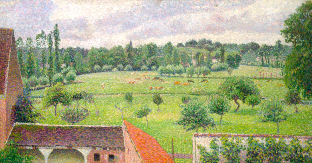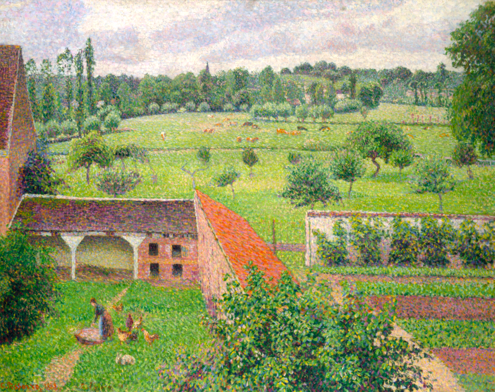 An 1886 (reworked in 1888) oil on canvas landscape, View from My Window, Éragny-sur-Epte, by Camille Pissarro (1830-1903), the Danish-French impressionist painter. The artist moved to Éragny in 1884 and lived there for the rest of his life. This is the view from his bedroom window and shows his experimentation with the pointillist style. (Ashmolean Museum, Oxford)