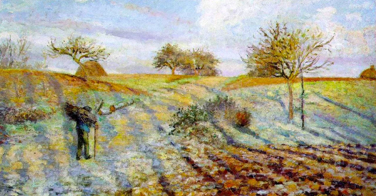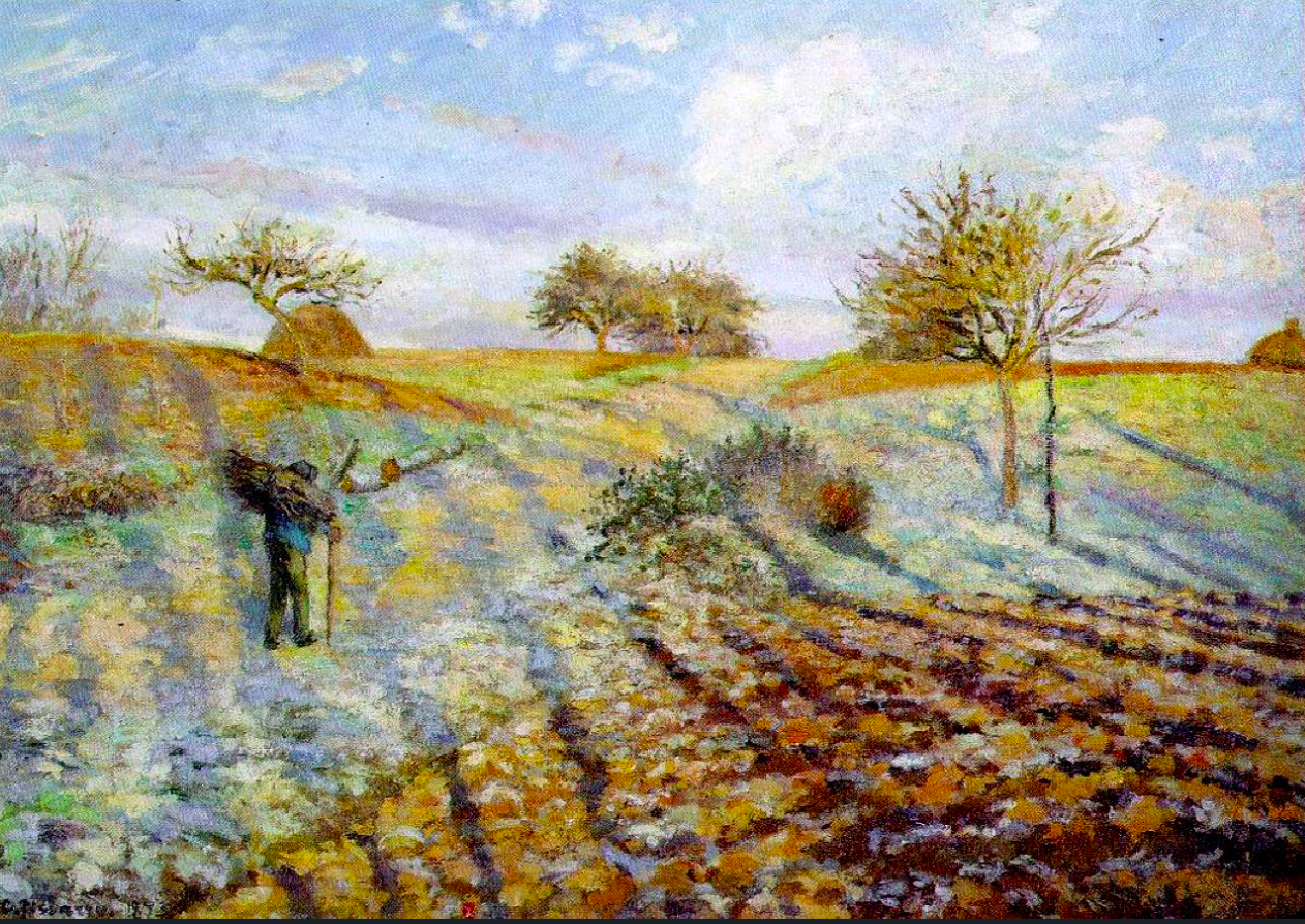An 1873 oil on canvas landscape, Hoar Frost, by Camille Pissarro (1830-1903), the Danish-French impressionist painter. This was selected by the artist for display in the First Impressionist Exhibition in Paris in 1874. It was savaged by the critics for its colouring, the shadows of trees which are out of the frame, and its perceived lack of finish. Pissarro paid the price for his innovation in landscape painting: having no progression of dark foreground to a lighter sky, having no particular frame like trees on the far left and right, and not giving any sense of distance but making the scene flat. (Musée d'Orsay, Paris)