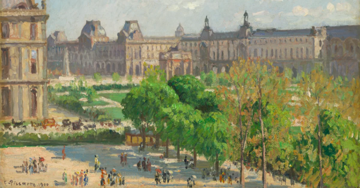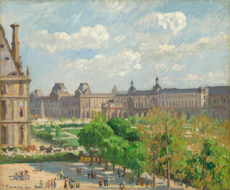 A 1900 oil on canvas landscape, Place du Carrousel, Paris, by Camille Pissarro (1830-1903), the Danish-French impressionist painter. Part of the 22-canvas series Pissarro created of various views of the Tuileries Gardens painted from his hotel balcony. (National Gallery of Art, Washington D.C.)