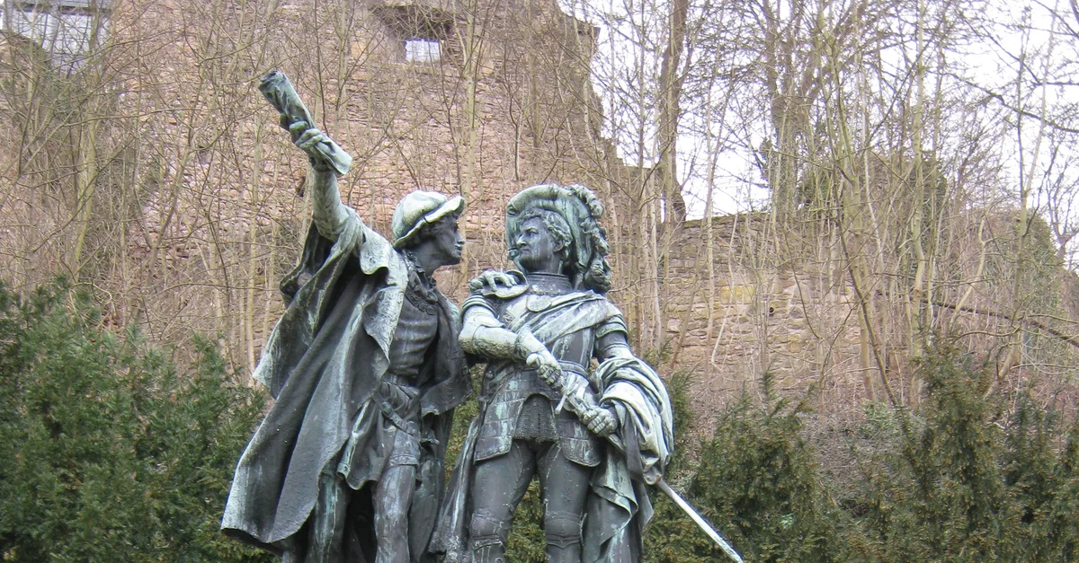 Statue of Ulrich von Hutten (l. 1488-1523) and Franz von Sickingen (l. 1481-1523), leaders of the Knights' Revolt of 1522-1523 in the Germanic territories of the Holy Roman Empire.
