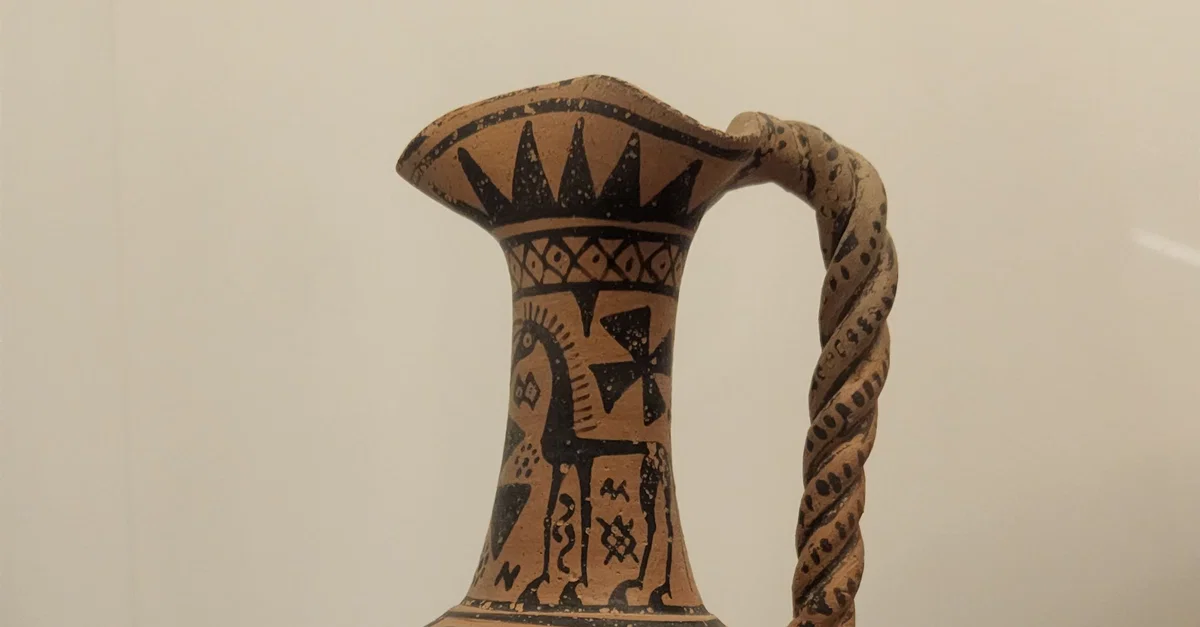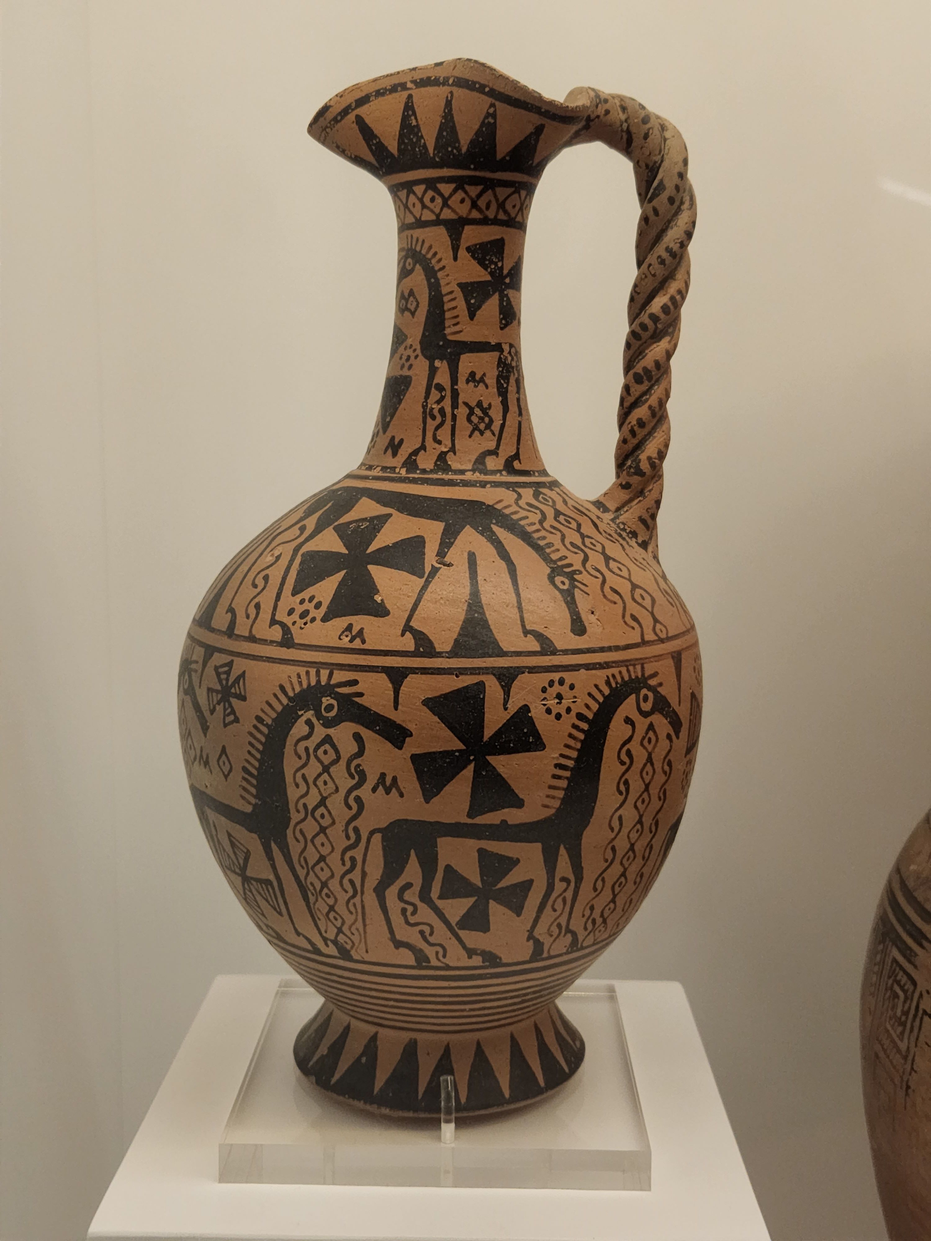 This vase is decorated with horses and a host of filling motifs. Most of the subjects derive from the Geometric tradition that continued to influence early Orientalising workshops in the 7th Century BCE. From Skyros, Sporades, 675-650 BCE. Made from clay. (Hellenic Museum, Melbourne, Victoria).