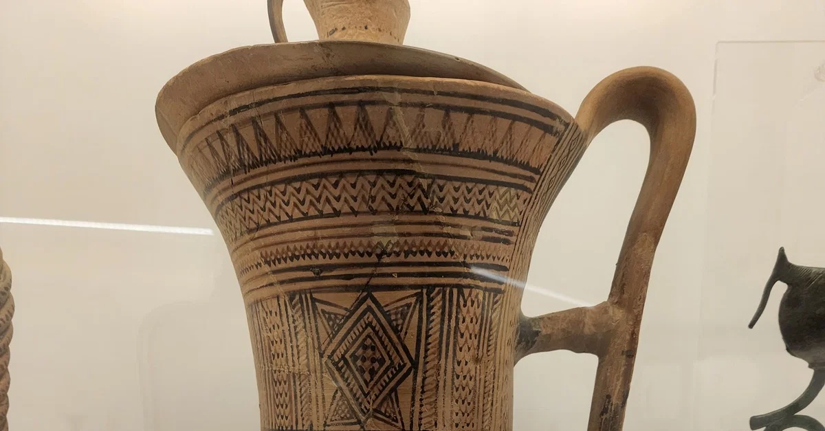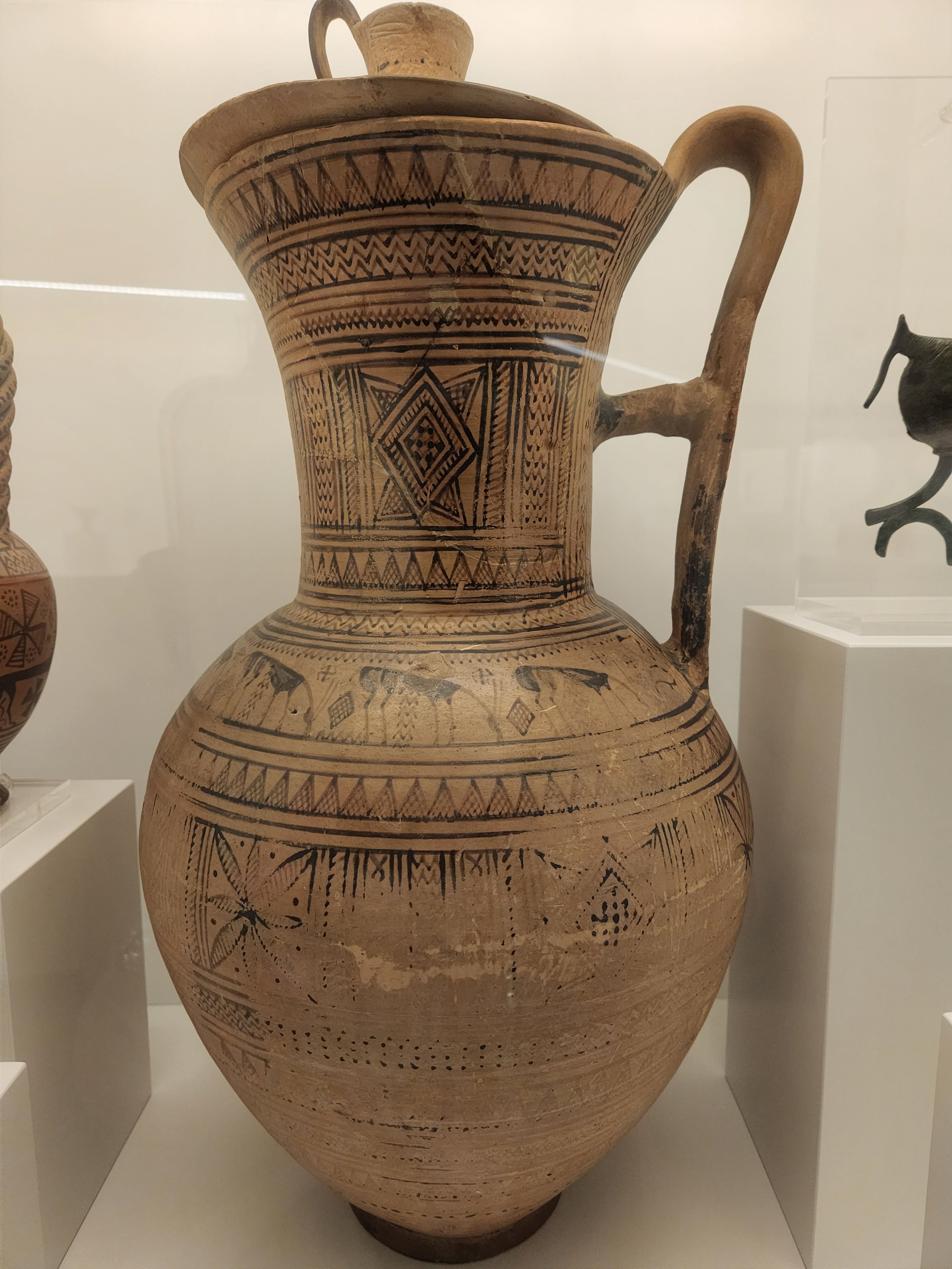 This pitcher is decorated with linear motifs and horses in successive zones. Vases of this class were used as cinerary urns in Attic burials during the Late Geometric Period. Found in an Attic workshop. Late Geometric II Period (735-720 BCE). Made from clay. (Hellenic Museum, Melbourne, Victoria).