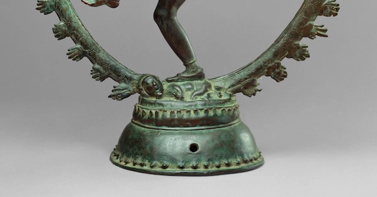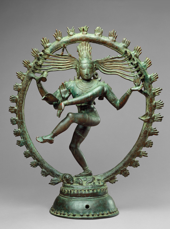 A bronze Chola sculpture of the Hindu god Shiva as the Lord of the Dance or Shiva Nataraja. He is represented in his triple role as Creator, Preserver, and Destroyer. Created c. 11th century CE. (Metropolitan Museum of Art, New York)
