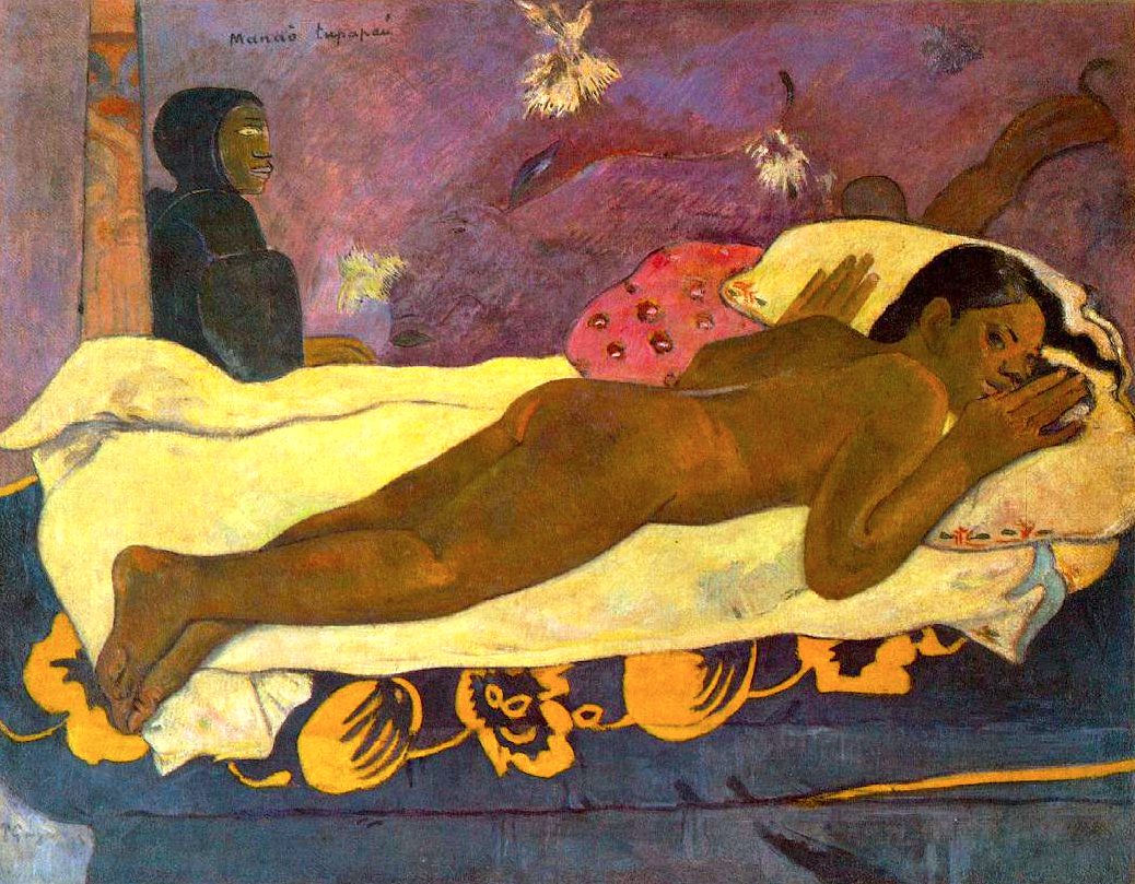 An 1892 oil on burlap mounted on canvas, Manao Tupapau (The Spirit of the Dead Watching), by Paul Gauguin (1848-1903) the French post-impressionist painter. Painted in Polynesia, the artist considered this one of his most important works. He was inspired by a real-life incident and the local legends of the Tupapaus, demons or spirits which prowl during sleepless nights. (Albright-Knox Art Gallery, Buffalo, USA)