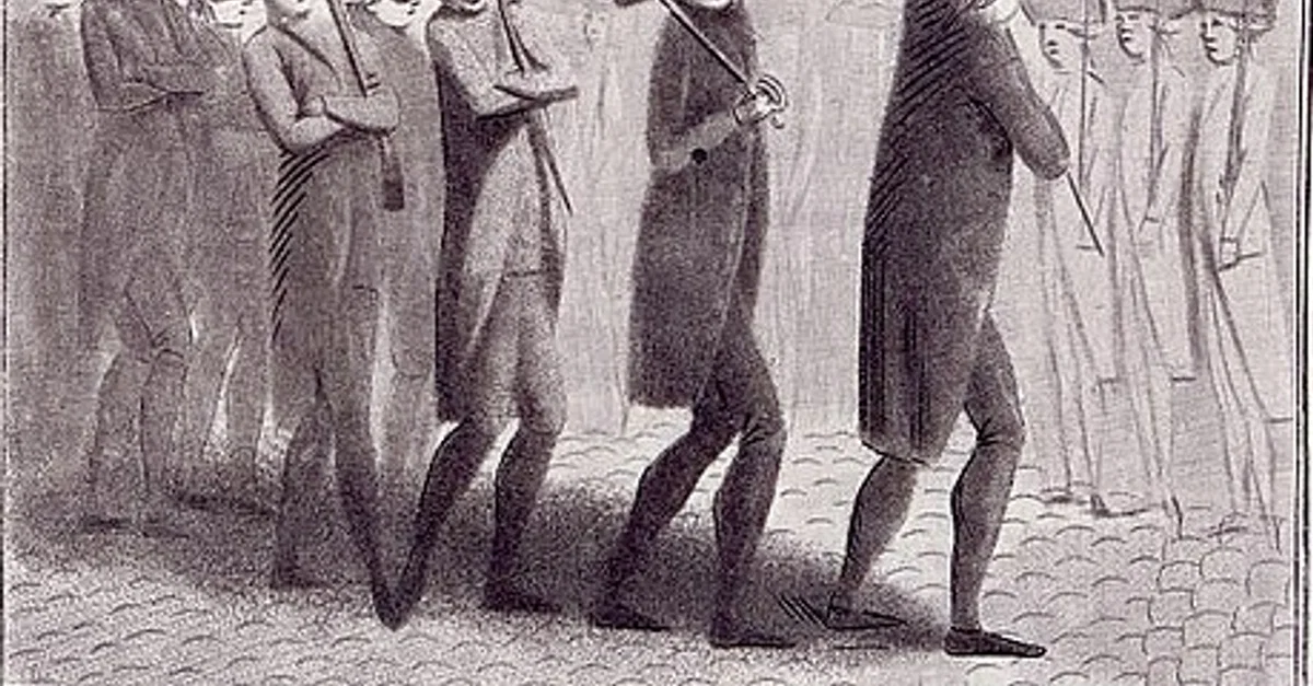 French soldiers or militia carry the severed heads of Bernard-René Jordan de Launay (1740-1789) and Jacques de Flesselles (1721-1789) on pikes following the Storming of the Bastille (14 July 1789). From an engraving, c. 1789, with a caption that reads, "thus we take revenge on traitors." In the French political cartoons collection of the Library of Congress.