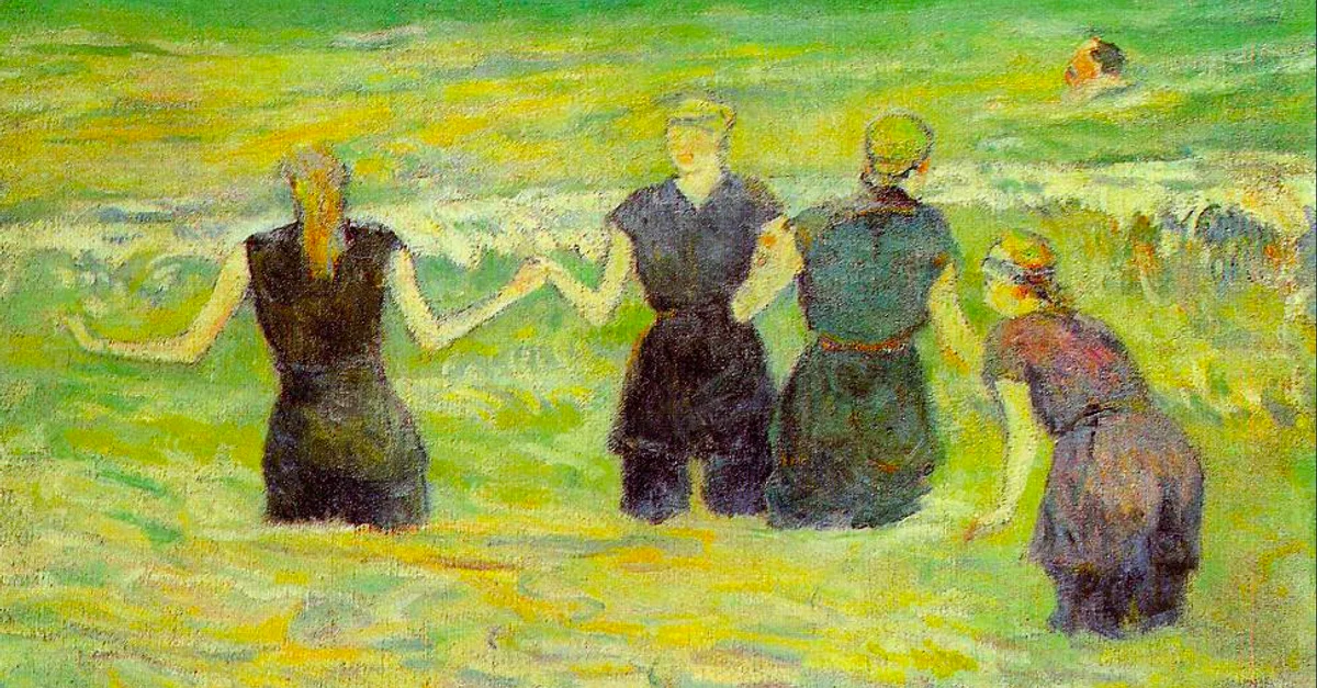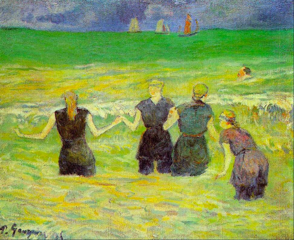 An 1885 oil on canvas, Women Bathing, Dieppe, by Paul Gauguin (1848-1903) the French post-impressionist painter. Although the artist was influenced by the impressionists and experimented with that technique, this work illustrates that Gauguin was also forging an original style of his own. (National Museum of Western Art, Tokyo)