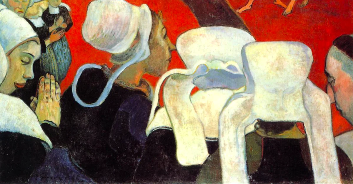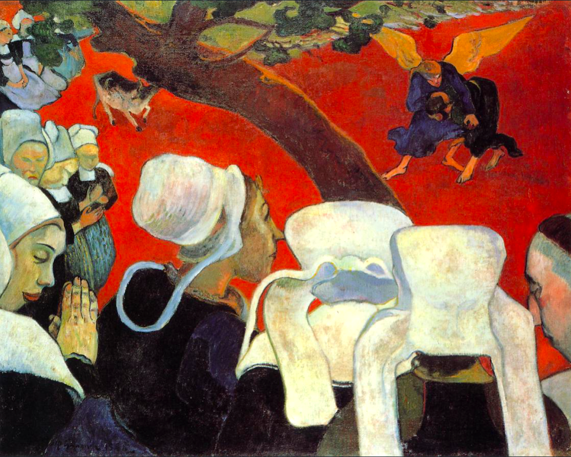 An 1888 oil on canvas, Vision after the Sermon, by Paul Gauguin (1848-1903), the French post-impressionist painter. The scene shows Breton women in their traditional headgear watching an enactment of a sermon they have just heard (from the priest on the far right): an angel wrestling Jacob. The work is typical of Gauguin's distinctive style with bold colours and a flattened perspective. The outlines are marked, and he uses symbolism in an overall composition that ignores a specific light source. (National Gallery of Scotland, Edinburgh)