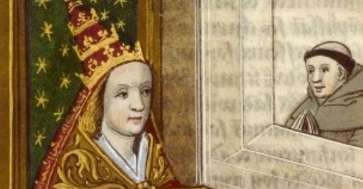 A 15-16th century manuscript illustration of Pope Joan, a legendary female pope of the Middle Ages said to have reigned from 855 to 858. Her existence is disputed. (Bibliothèque nationale de France).
