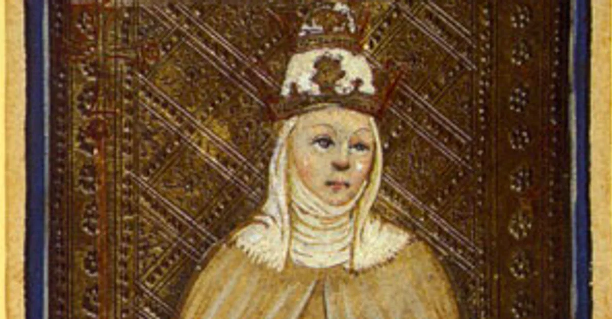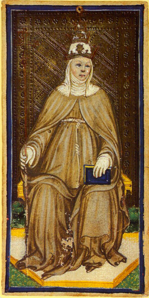 A c. 1450 tarot card showing a female pope, perhaps inspired by the story of Pope Joan who was a legendary female pope of the Middle Ages said to have reigned from 855 to 858. Her existence is disputed. From the Visconti-Sforza tarot deck by Bonifacio Bembo.