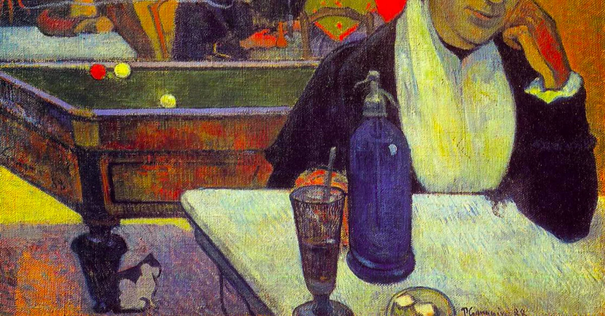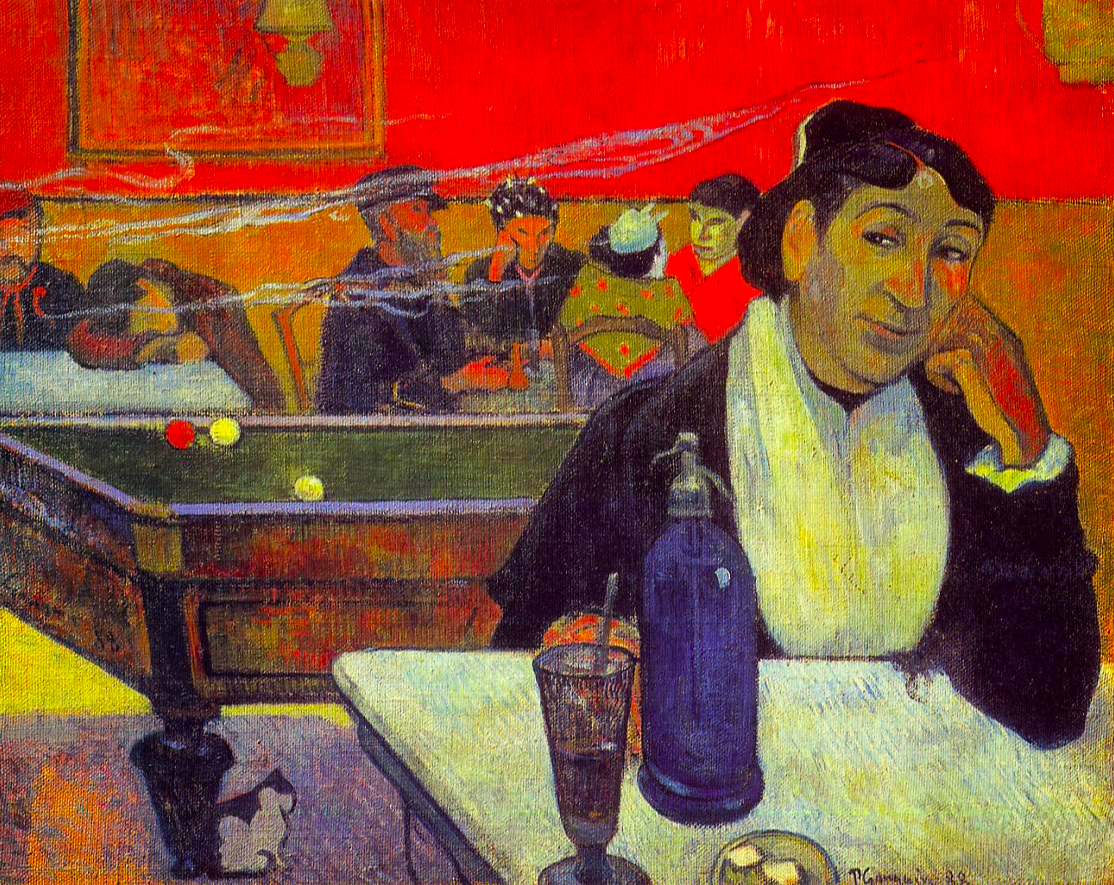 An 1888 oil on jute painting, In the Café (aka Night Café at Arles), by Paul Gauguin (1848-1903) the French post-impressionist painter. Created while living in Arles, southern France, with Vincent van Gogh (1853-90), who painted a very similar portrait. Gauguin described the subject of the painting in a letter: "I've done the café which van Gogh likes very much and I like rather less. Basically, it isn't my thing, and the coarse local colour doesn't suit me." (Hodge, 160). It was painted on jute as this was cheaper than canvas. (Pushkin State Museum of Fine Arts, Moscow)