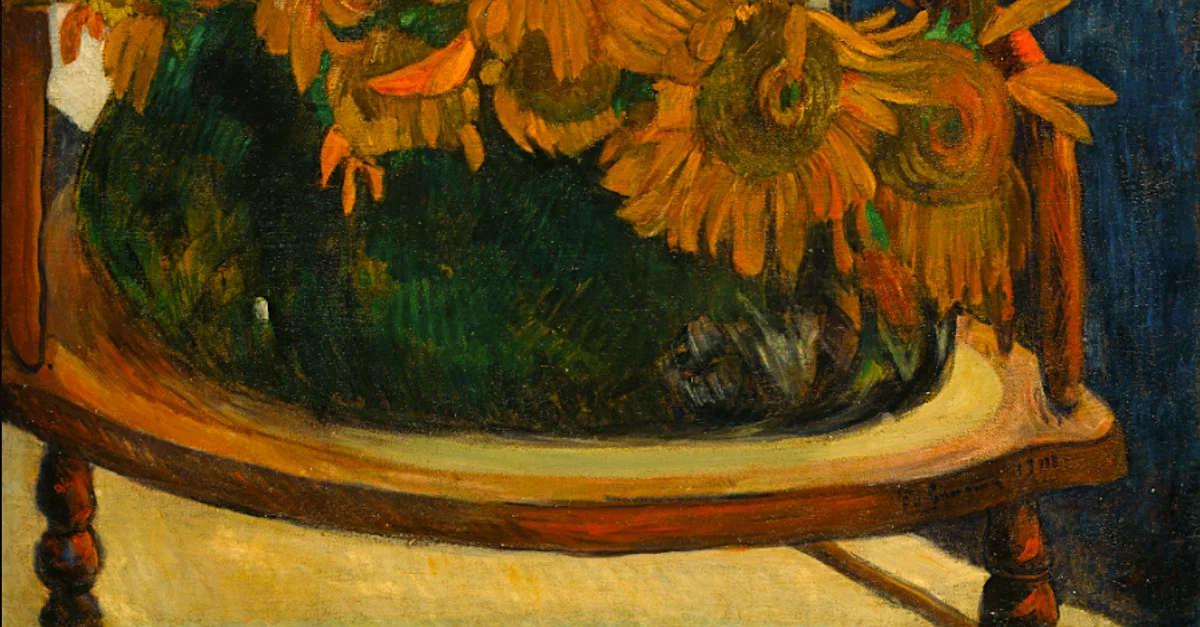A 1901 oil on canvas still life, Sunflowers in an Armchair, by Paul Gauguin (1848-1903), the French post-impressionist painter. Gauguin had asked for seeds of sunflowers to be sent to him from Europe so that he could grow the flowers in his garden in Tahiti. Gauguin painted four similar still lifes, and one is tempted to think he was feeling nostalgic for his time in France and Arles where he so admired Vincent van Gogh's (1853-1890) sunflower paintings. (Stiftung Samlung E. G. Bührle, Zürich)