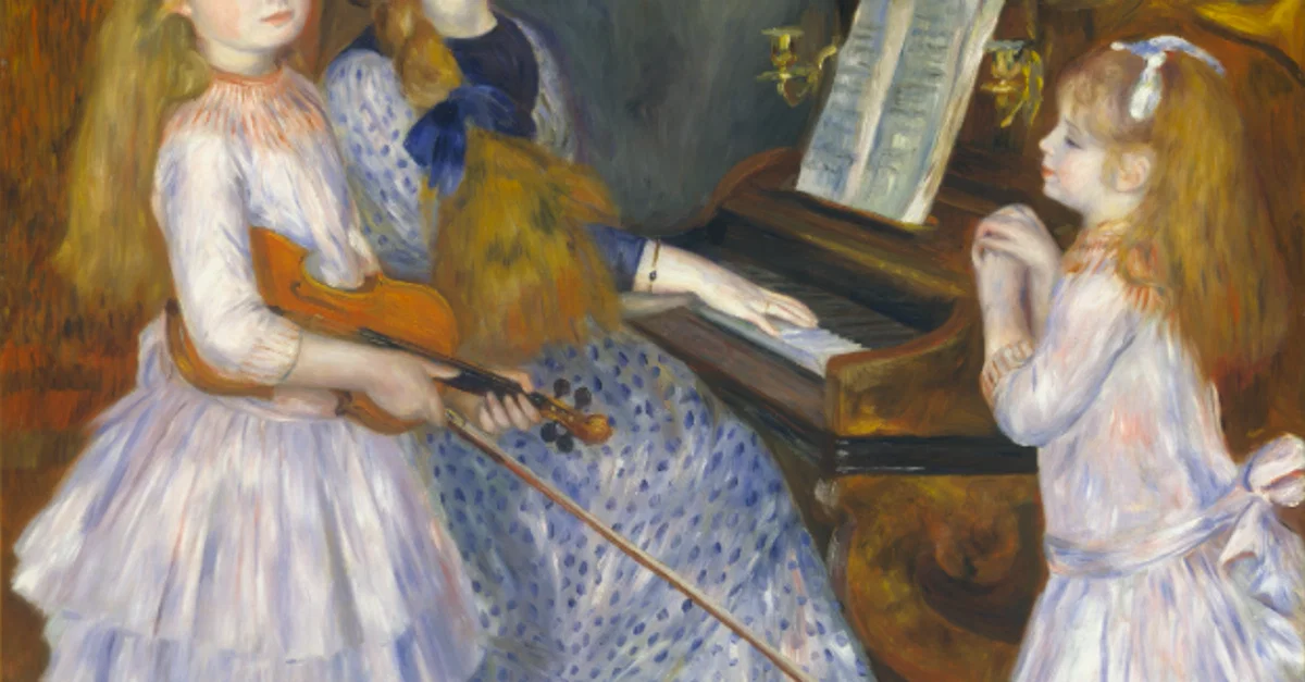 An 1888 oil on canvas group picture, The Daughters of Catulle Mendès (aka Young Girls at the Piano), by Pierre-Auguste Renoir (1841-1919) the French impressionist painter. The three girls are Huguette (1871-1964), Claudine (1876-1937), and Helyonne (1879-1955). The painting shows the translucent colours typical of Renoir's mature style. (Metropolitan Museum of Art, New York)