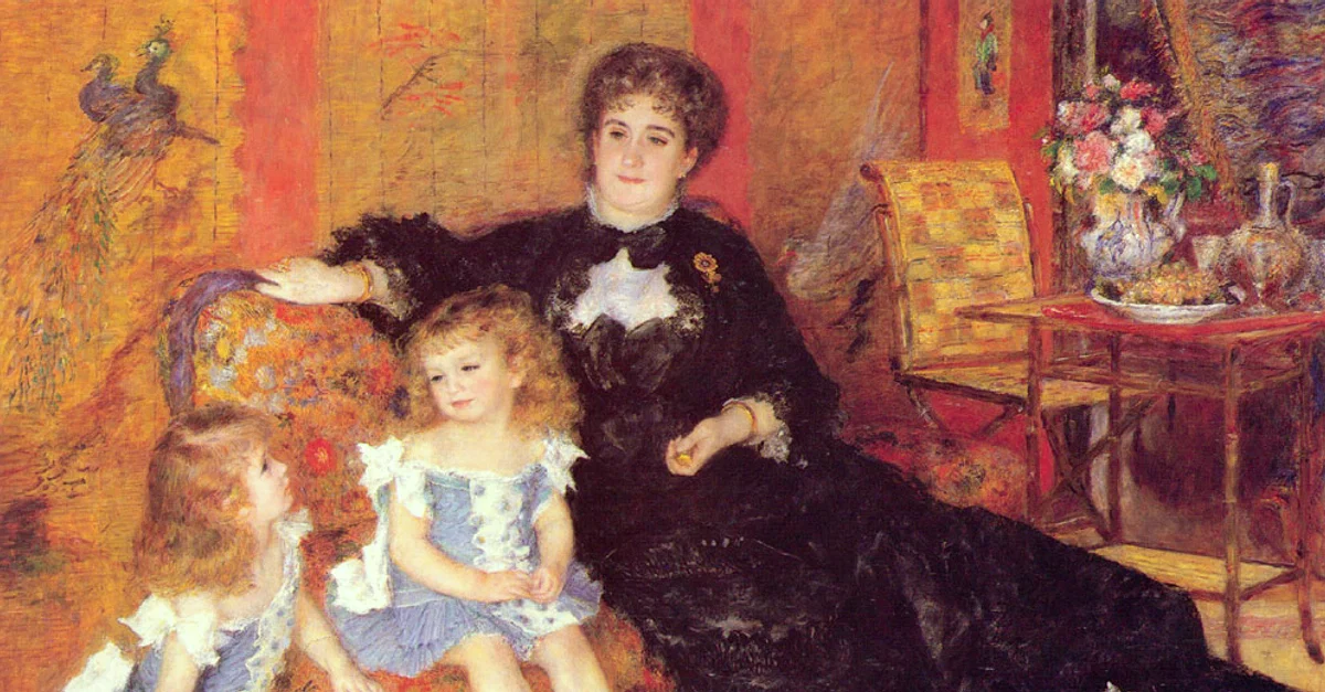 An 1878 oil on canvas, Madame Charpentier and Her Children, by Pierre-Auguste Renoir (1841-1919) the French impressionist painter. Georges Charpentier was a publisher who commissioned many works from the artist. The two girls are shown in the natural and spontaneous poses typical of Renoir's work. The artist gives the scene a deliberately flat look as in the Japanese prints popular in France at the time. Only the design of the rug gives any sense of perspective. Perhaps not coincidentally, the artist has chosen to place his subjects in their Japanese-style drawing-room. This painting was shown with success at the Paris Salon of 1879. (Metropolitan Museum of Art, New York)