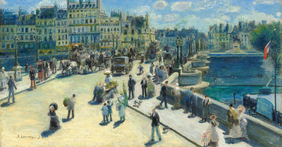 An 1872 oil on canvas, The Pont Neuf, by Pierre-Auguste Renoir (1841-1919) the French impressionist painter. The artist here caught the rich variety of people who crossed one of the city's major bridges. In order to capture specific types, Renoir had his brother Edmond stop passers-by and ask them directions so that they could be sketched. (National Gallery of Art, Washington D.C.)