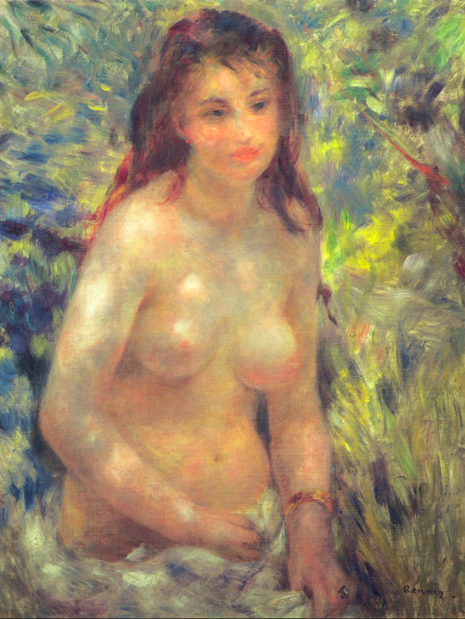 An 1875 oil on canvas, Nude in Sunlight (aka Study: Torso Effect of Sunlight), by Pierre-Auguste Renoir (1841-1919) the French impressionist painter. This work was shown in the 1876 Second Impressionist Exhibition in Paris and was savaged by the critics. One critic described the green and purple effects of light on the girl's skin as resembling a putrified corpse. (Musée d'Orsay, Paris)