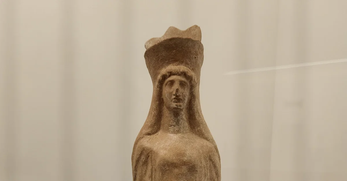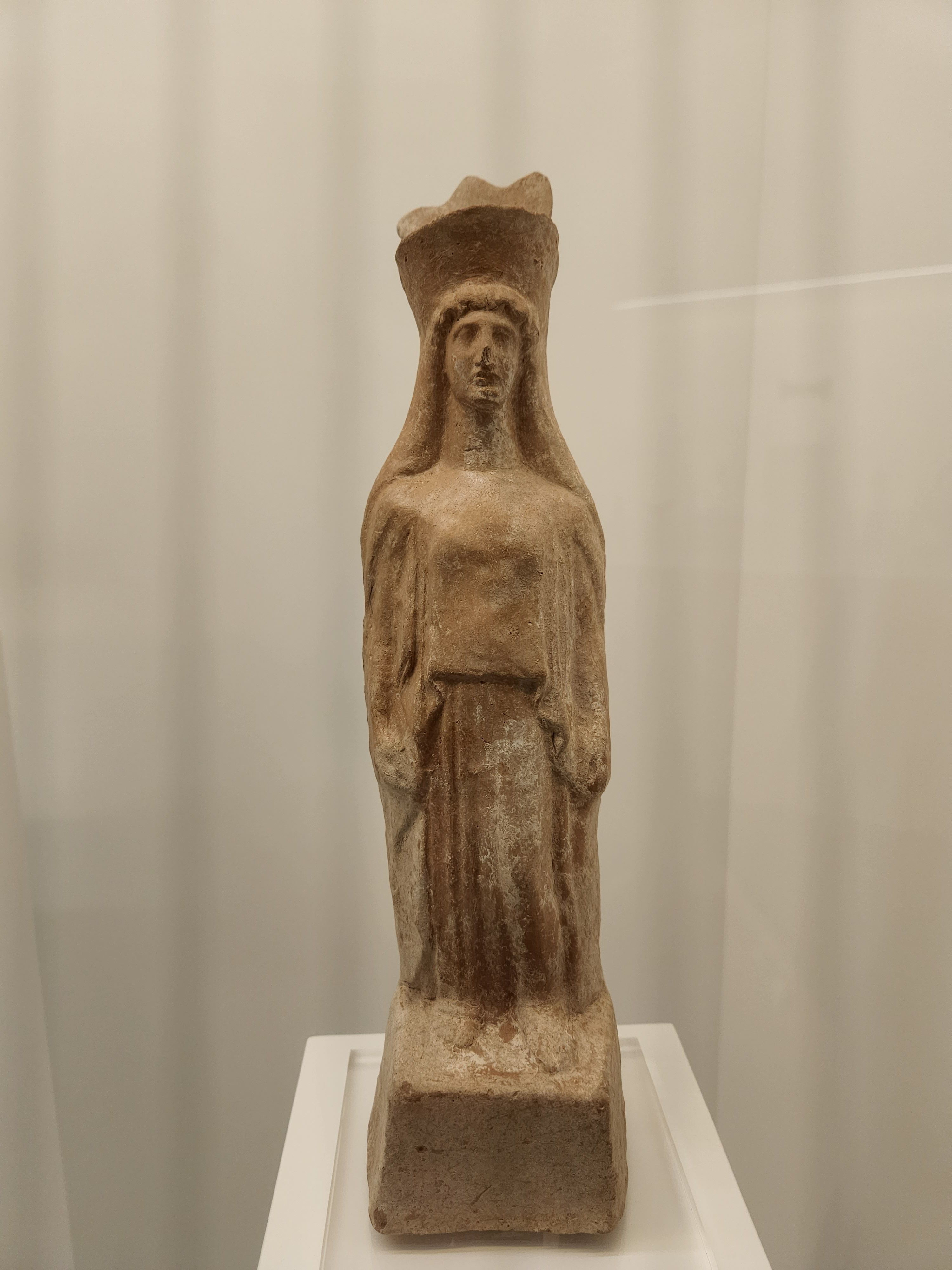 This figure is wearing a peplos (long garment) and a polos (high cylindrical crown). Figurines of this class, which are reminiscent of the Archaic korai in monumental sculpture, were grave goods or votive offerings in sanctuaries. They possibly represent female deities or worshippers.