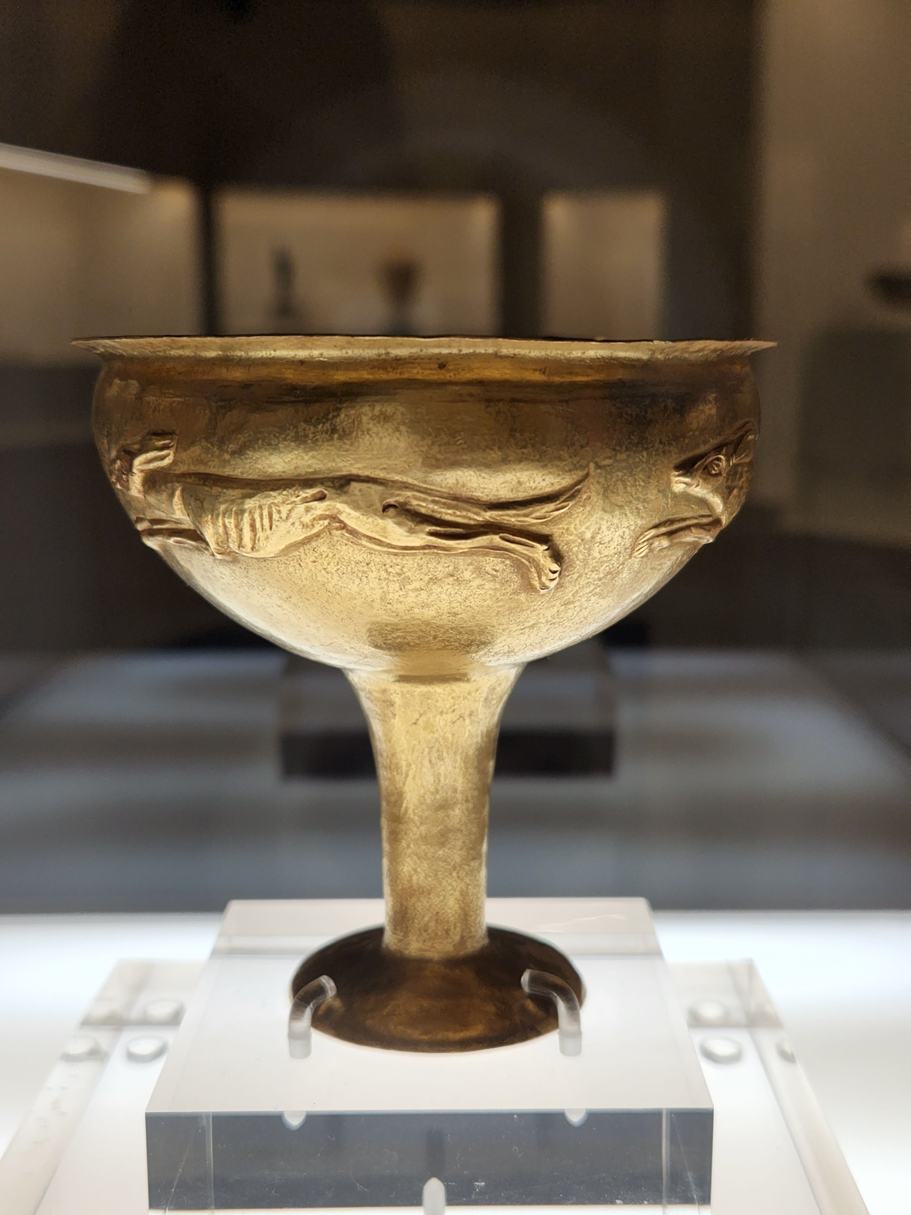 The decoration of this object of prestige and social status with hounds is related to the hunting, an activity that constitutes an ideal means of replicating power and authority. Made from gold.