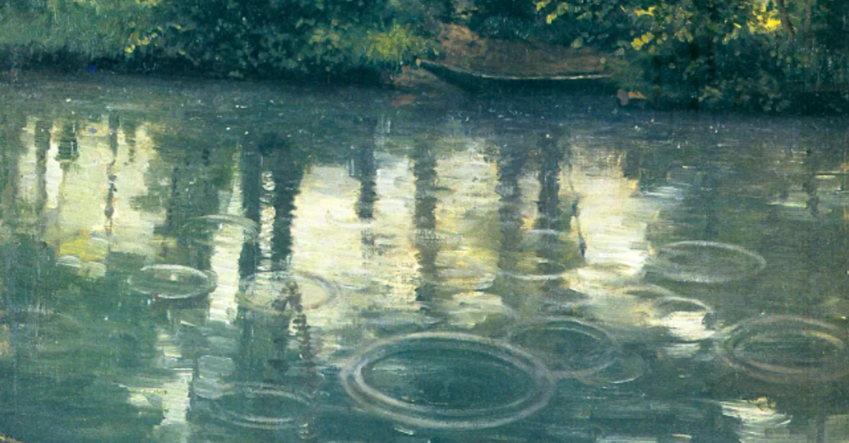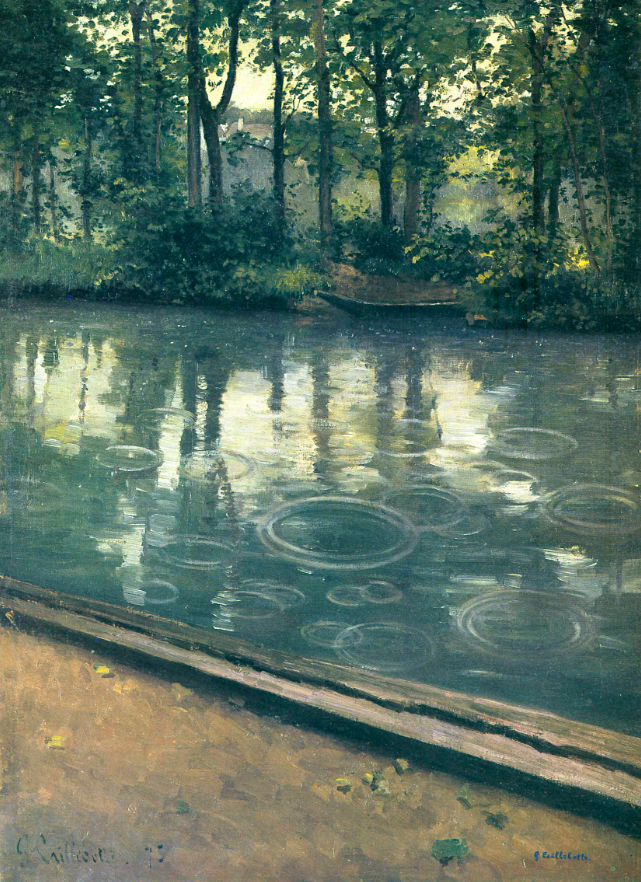 An 1875 oil on canvas, The Yerres, Effect of Rain, by Gustave Caillebotte (1848-96) the French impressionist painter. The Caillebotte family lived by the river Yerres in northern France. Here the artist has boldly removed all possible subjects from the scene to focus on the effect of the raindrops on the water. (Eskenazi Museum of Art, Indianan, U.S.A.)
