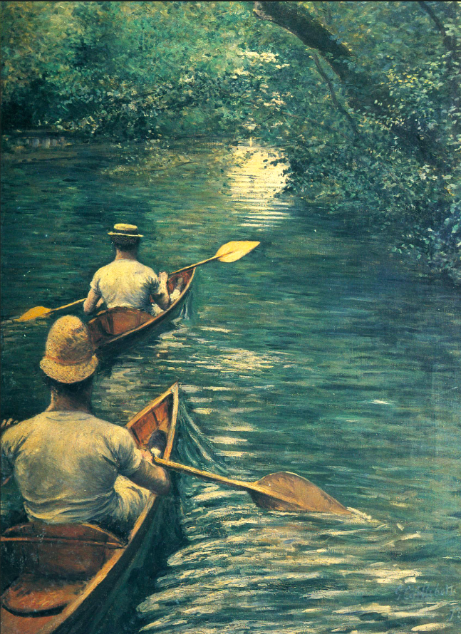 A c. 1878 oil on canvas, The Canoe Paddlers, by Gustave Caillebotte (1848-96) the French impressionist painter. Full of the artist's trademark diagonals, the framing of this painting is inspired by the burgeoning art of photography. (Musée des Beaux-Arts, Rennes, France)