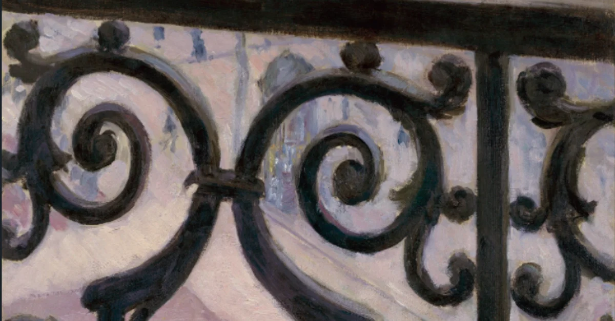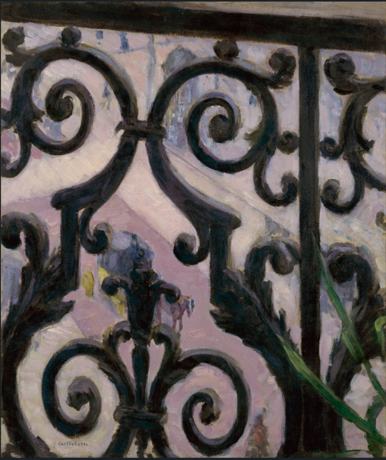 An 1880 oil on canvas, View from a Balcony, by Gustave Caillebotte (1848-96) the French impressionist painter. Here the artist takes his fascination with including ornate iron balcony railings in his paintings to the extreme and has the entire canvas devoted to a street scene as seen through the railings. (Van Gogh Museum, Amsterdam)