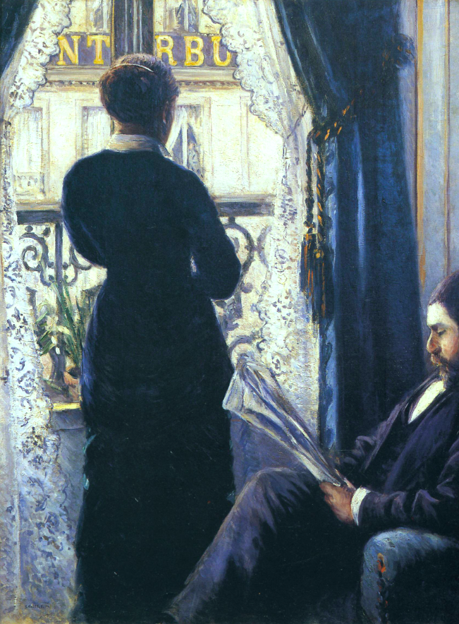 An 1880 oil on canvas, Woman at the Window (aka Interior), by Gustave Caillebotte (1848-96) the French impressionist painter. A typical Caillebotte view showing a person connecting to the outside world through their window. The strong blue-grey tones are another feature of the artist's style in this period. (Private Collection)