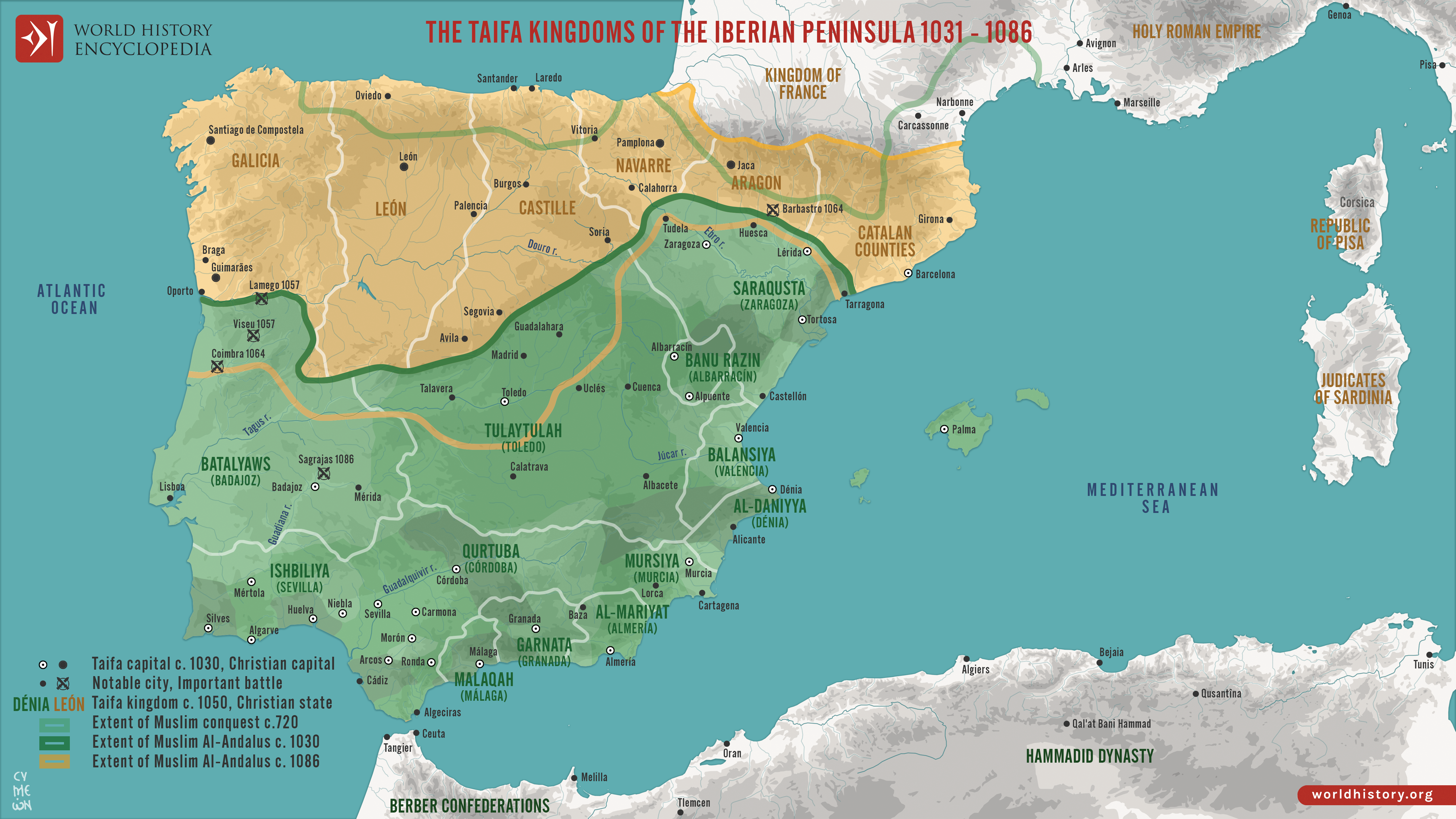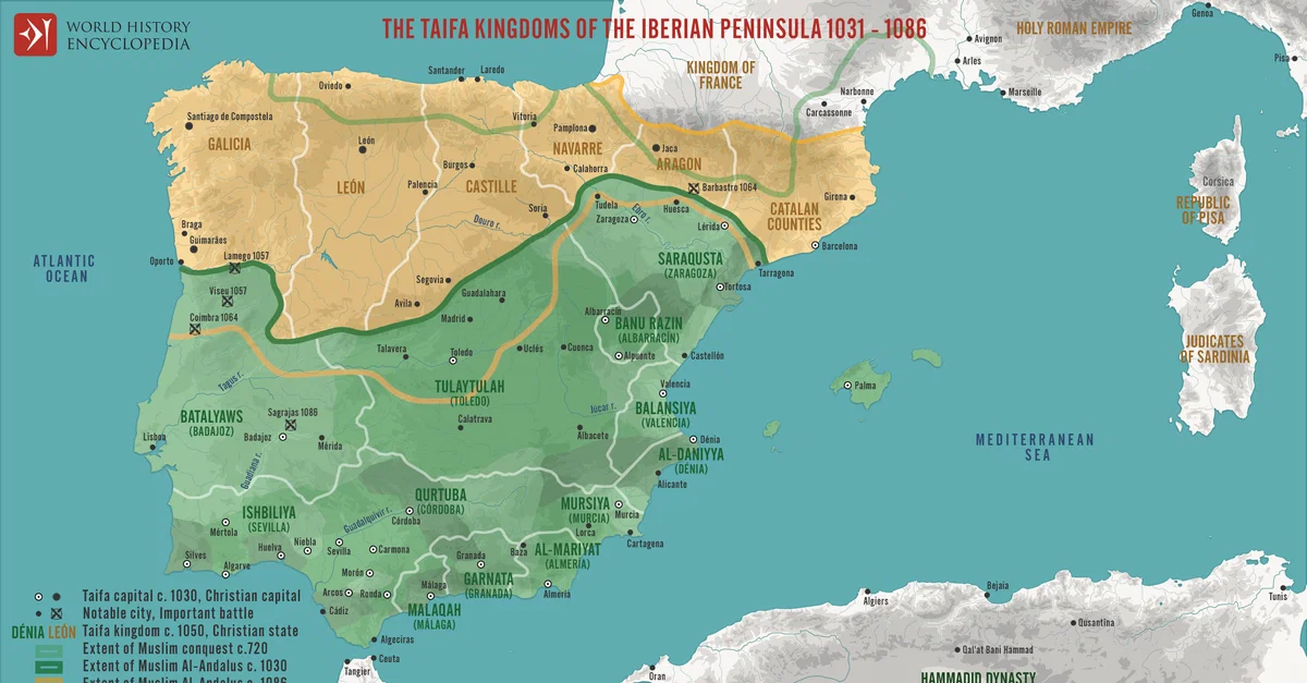 Netchev, S. (2025, December 27). Map of the Taifa Kingdoms of al-Andalus (c. 1031–1086): Iberian Peninsula on the Eve of the Almoravid Intervention. World History Encyclopedia. https://www.worldhistory.org/image/15872/map-of-the-taifa-kingdoms-of-al-andalus-c-1031-108/