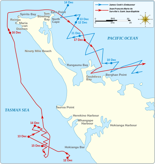 The route of the St Jean Baptiste and Captain James Cook's Endeavour around the North Cape of New Zealand in December 1769.