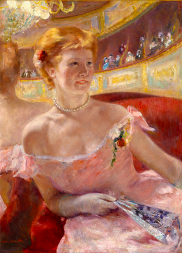 An 1879 oil on canvas, Woman with a Pearl Necklace in a Loge, by Mary Cassatt (1844-1926), the American impressionist painter. In the 19th century, society still generally frowned upon women becoming artists, and so Cassatt, along with Berthe Morisot, certainly broke the rigid mould of convention, opening the door to future female artists. (Philadelphia Museum of Art, USA)