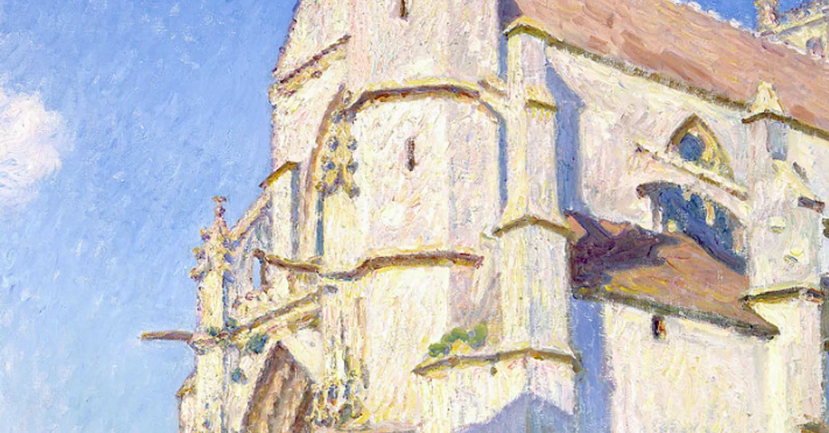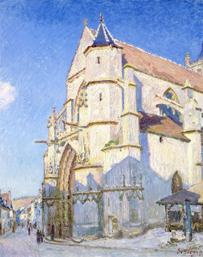 An 1894 oil on canvas, The Church at Moret, Evening, by Alfred Sisley (1839-1899), the Franco-British impressionist painter. Sisley painted this work at Moret-sur-Loing as part of a series to show the changing effects of light and colour on the same subject. Claude Monet was working on a similar series of Rouen Cathedral, and these impressionist projects show that the subject was, in some ways, becoming less important than the techniques used to render them. (Musée des Beaux-Arts de la Ville de Paris)