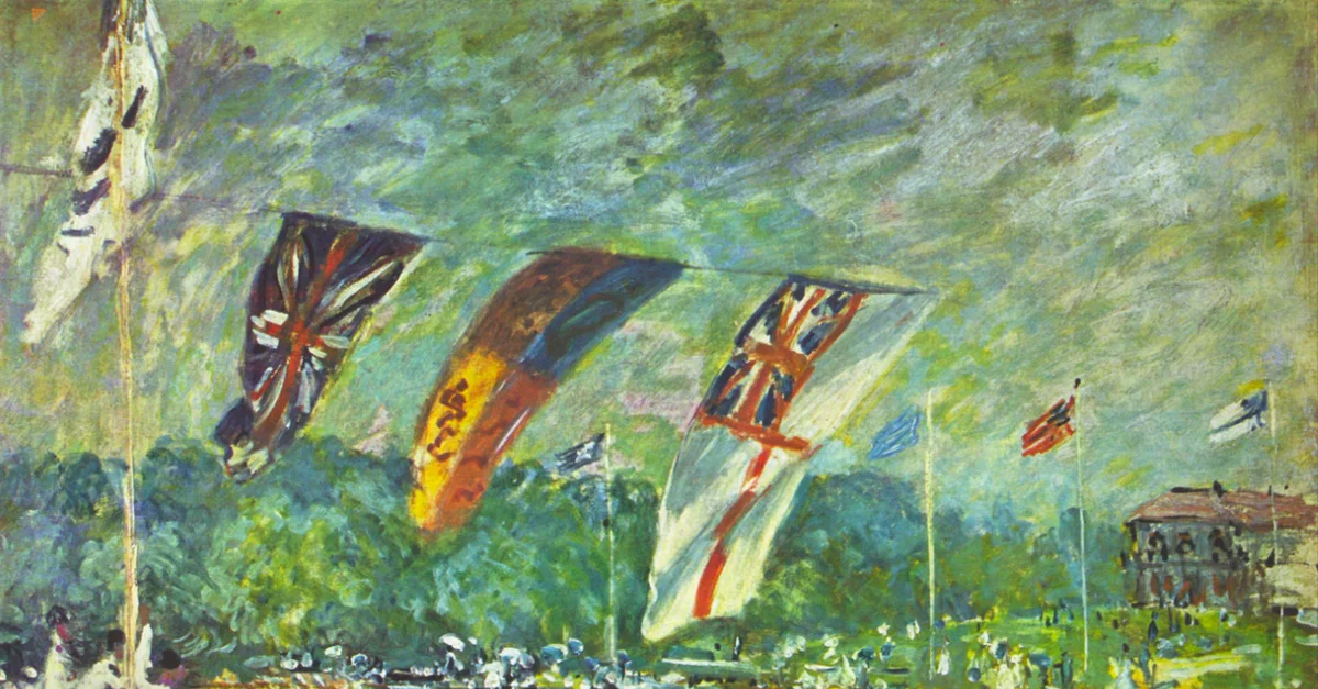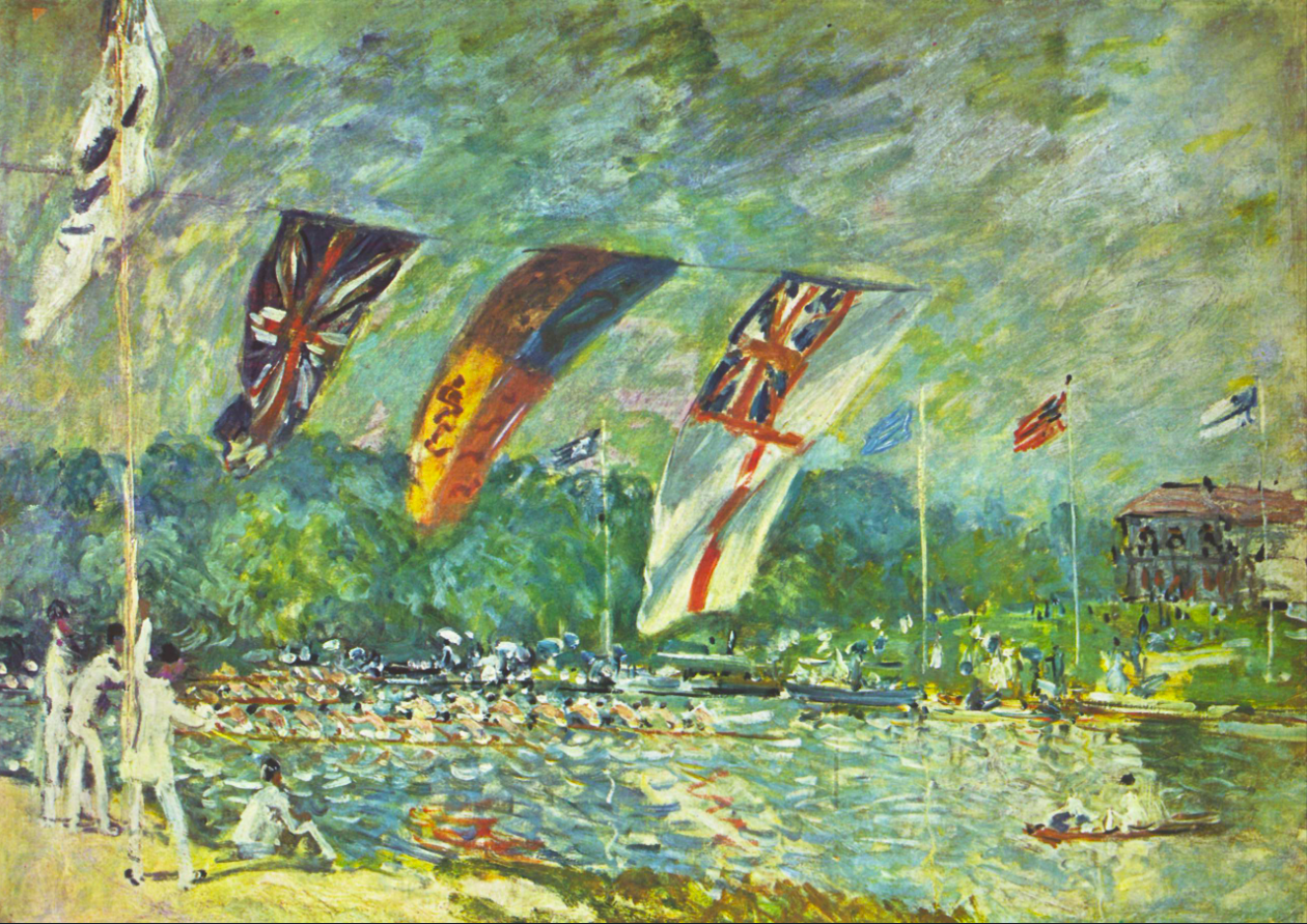 An 1874 oil on canvas, The Regatta at Molesey, by Alfred Sisley (1839-1899), the Franco-British impressionist painter. Painted at Molesey near Hampton Court, Sisley here captures the impression of flags caught in a breeze. The artist wrote, "These effects of light which have an almost material expression in nature must be rendered in material fashion on the canvas" (Howard, 87). (Musée d'Orsay, Paris)