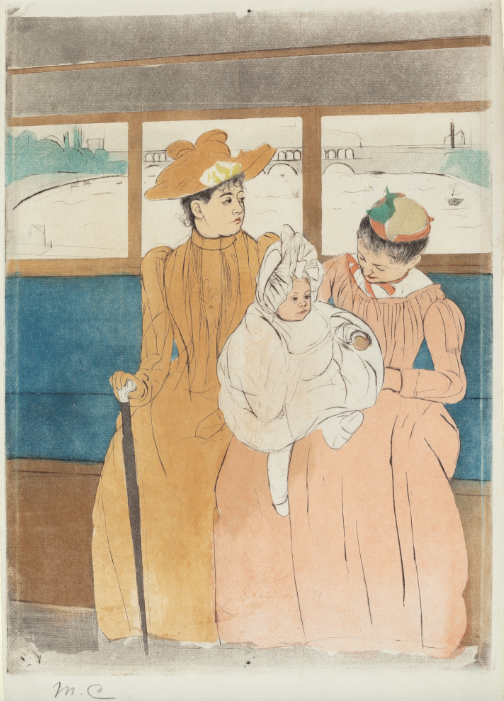 An 1891 drypoint and aquatint, In the Omnibus, by Mary Cassatt (1844-1926), the American impressionist painter. This colour print was one of ten the artist included in her first solo exhibition in 1891. (National Gallery of Art, Washington D.C.)